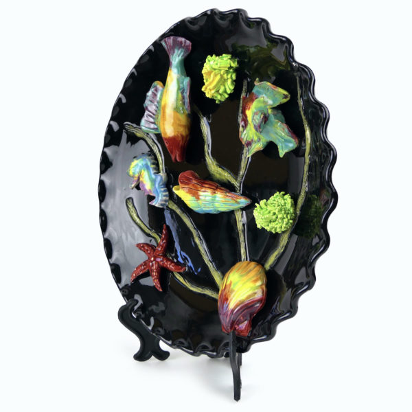 Assiette ronde Vallauris barbotine multicolore vintage émaillée sur fond noir
