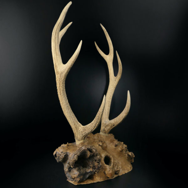 Crâne au lézard en bois de tamarin et bois de cerf sur pied Vanité Memento mori