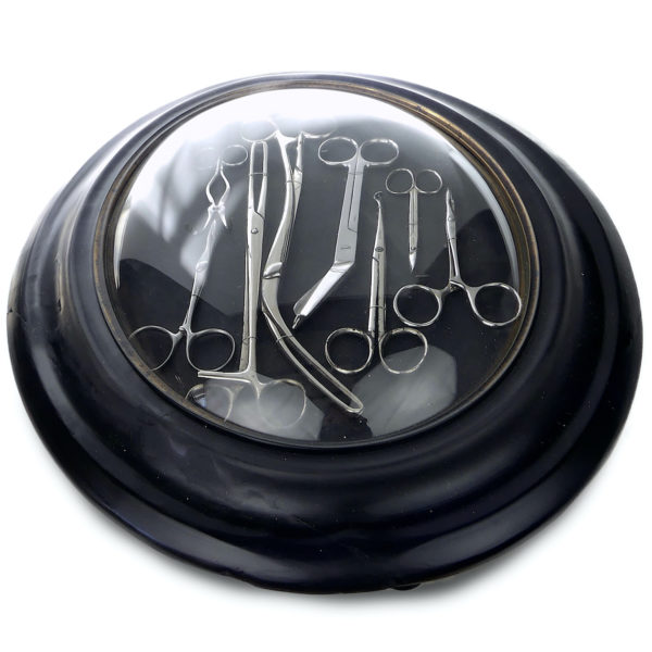 Sept outils médicaux ciseaux et pinces sous verre bombé et cadre ovale XIXe