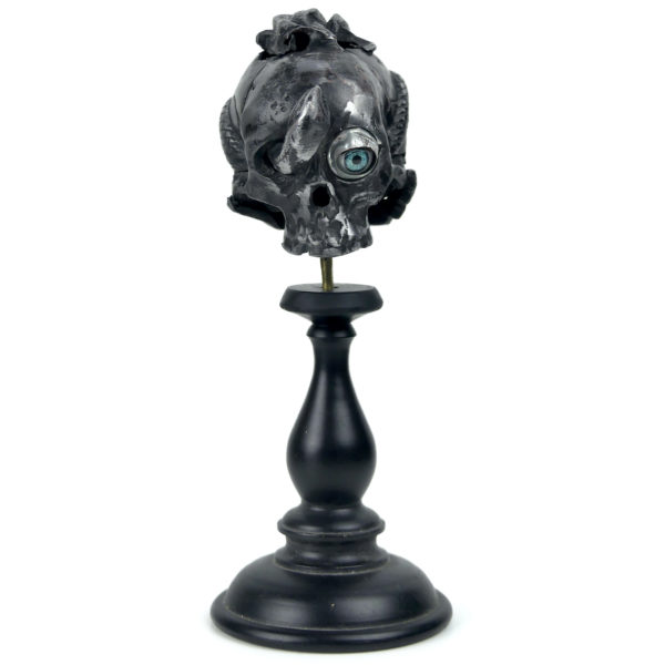 Petit crâne au serpent ciselé en étain sur pied en bois tourné noir Vanité Pascal Jean