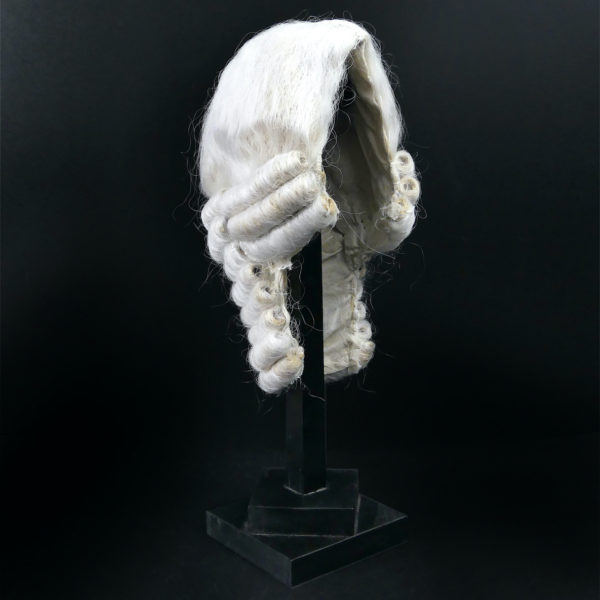 Perruque courte blanche sur porte perruque en bois noir
