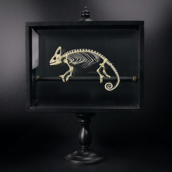 Squelette de caméléon casqué dans son cadre noir sur pied