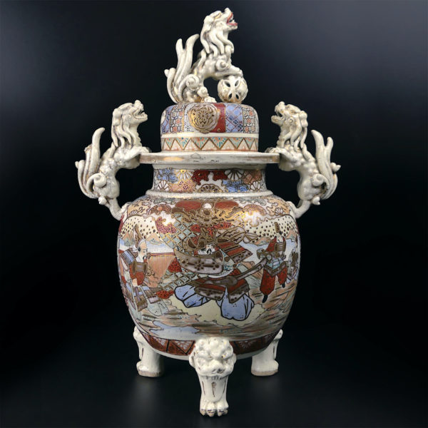 Grand satsuma koro japonais aux lions gardiens en porcelaine Ére Meiji Japon