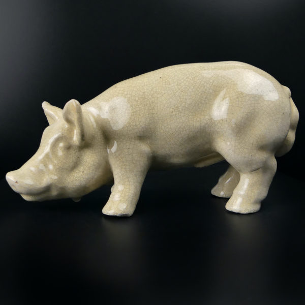 Cochon en céramique craquelée émaillée beige mascotte de boucherie années 50