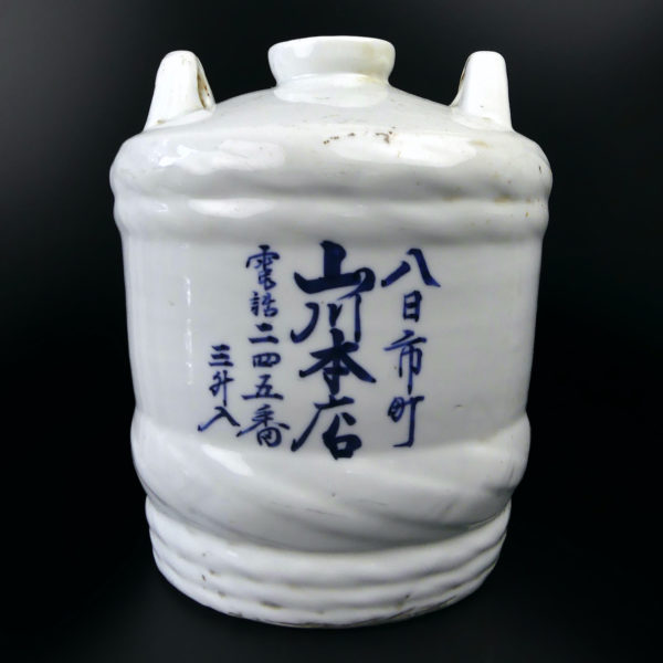 Baril à saké japonais Taru Dario en porcelaine calligraphié kanjis bleus