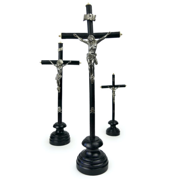 Trois crucifix XIXe en bois noir métal et os sur pied en bois tourné Napoléon III