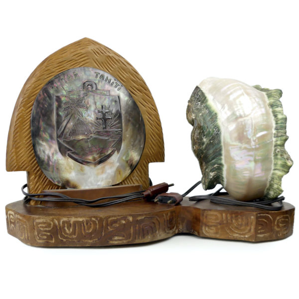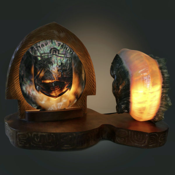 Lampe d’ambiance polynésienne double en coquilles coquillage et bois précieux RIMAP Tahiti