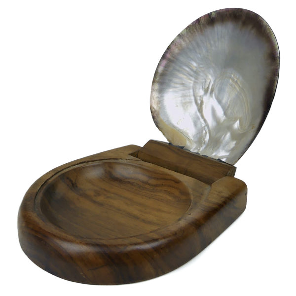 Boîte à bijoux polynésienne en coquille de nacre noire ciselée et bois de rose