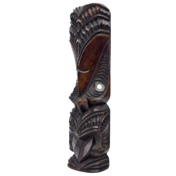 Teko Teko Maori ancien en bois brun et ormeaux Bas-relief Nouvelle-Zélande