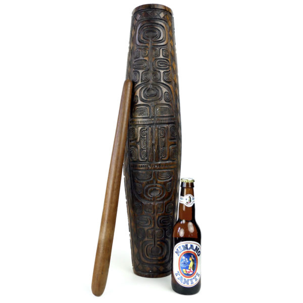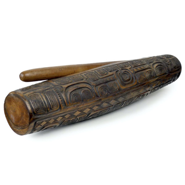 Grand toere tambour à fente polynésien en bois sculpté et son aito