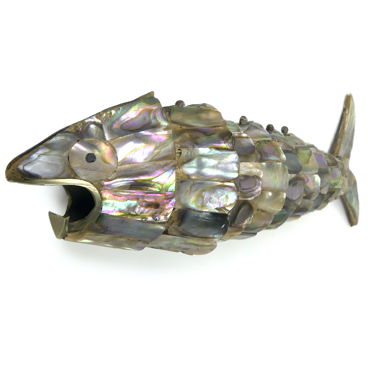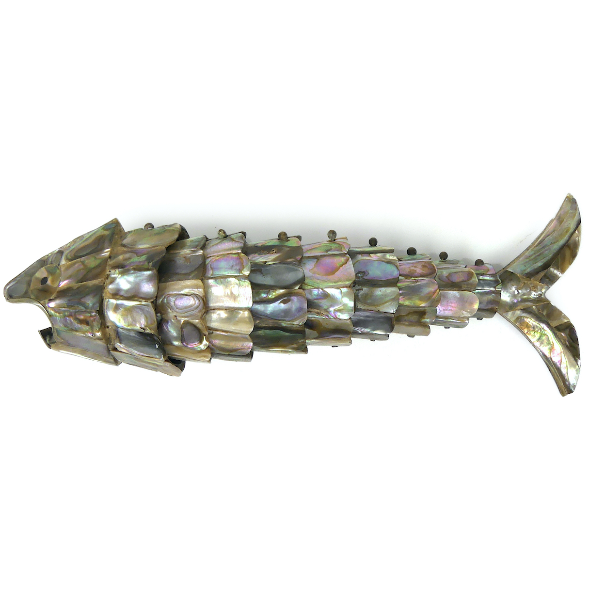 Décapsuleur poisson articulé en plaques d’ormeau – Argent et nacre – Mexique – Mi-XXe