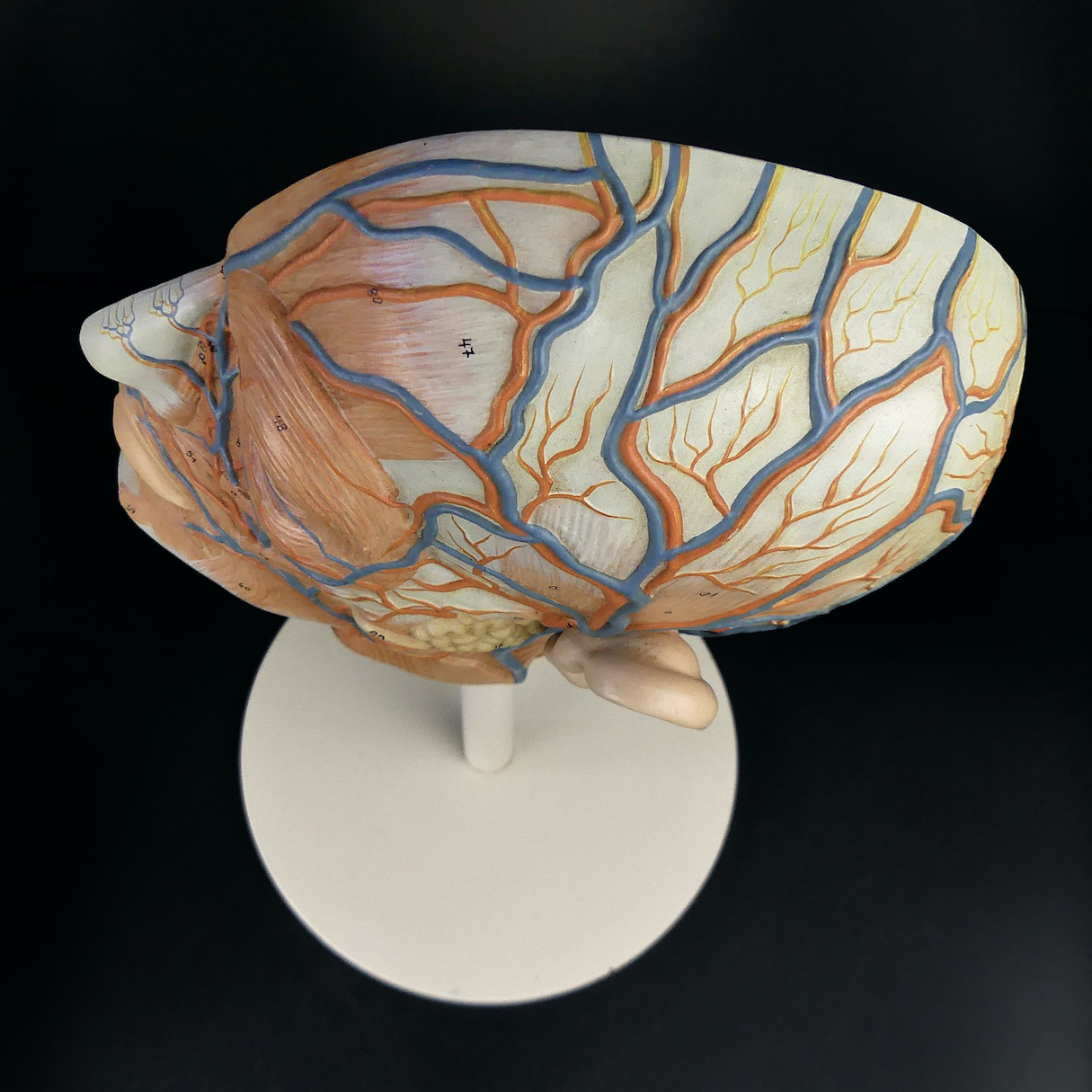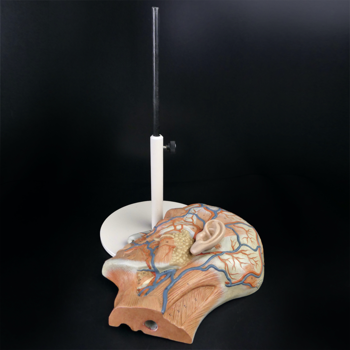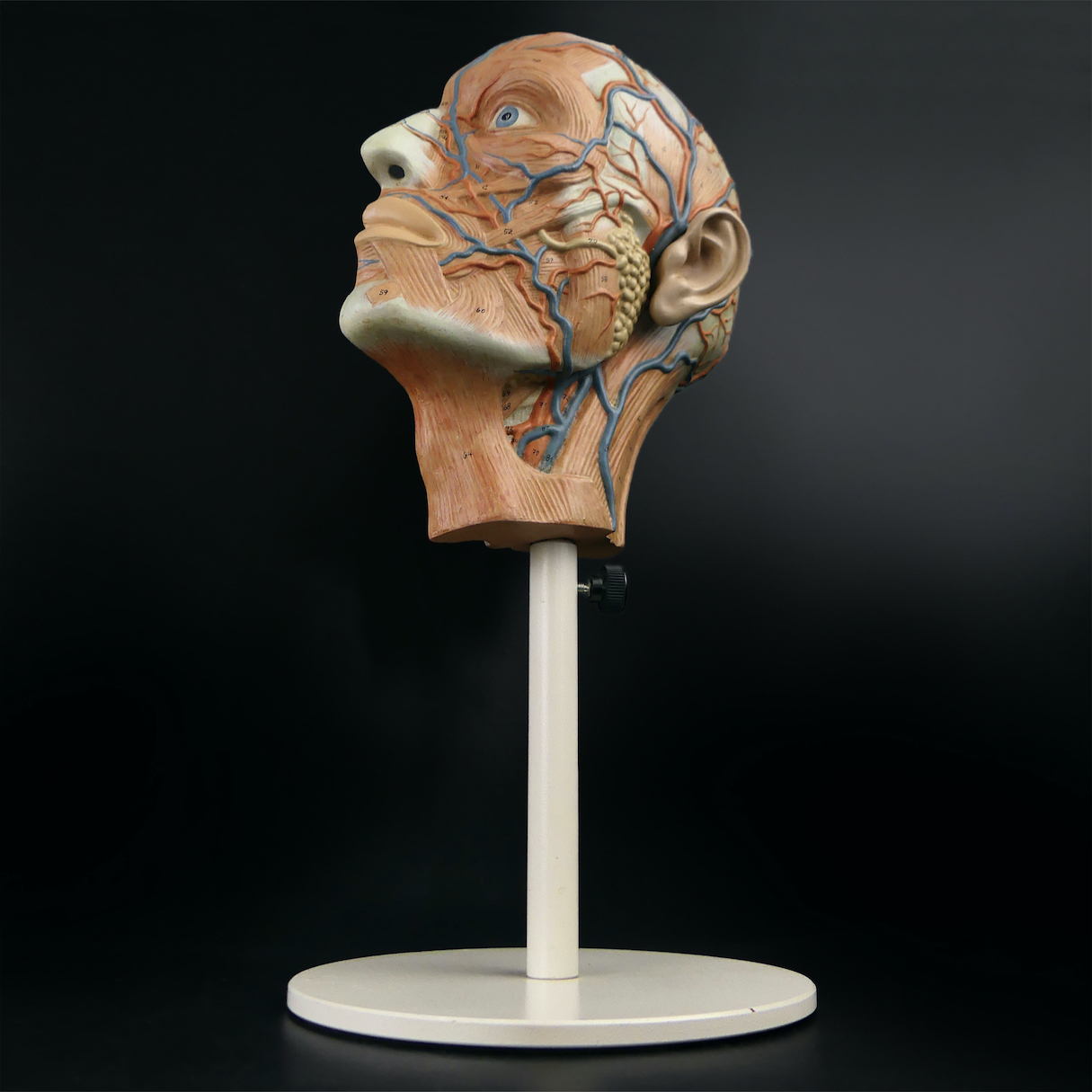 Moulage en PVC représentant une demi-tête humaine dépouillée de sa peau et des tissus graisseux, pour en faire apparaître les parties internes, veines et muscles.