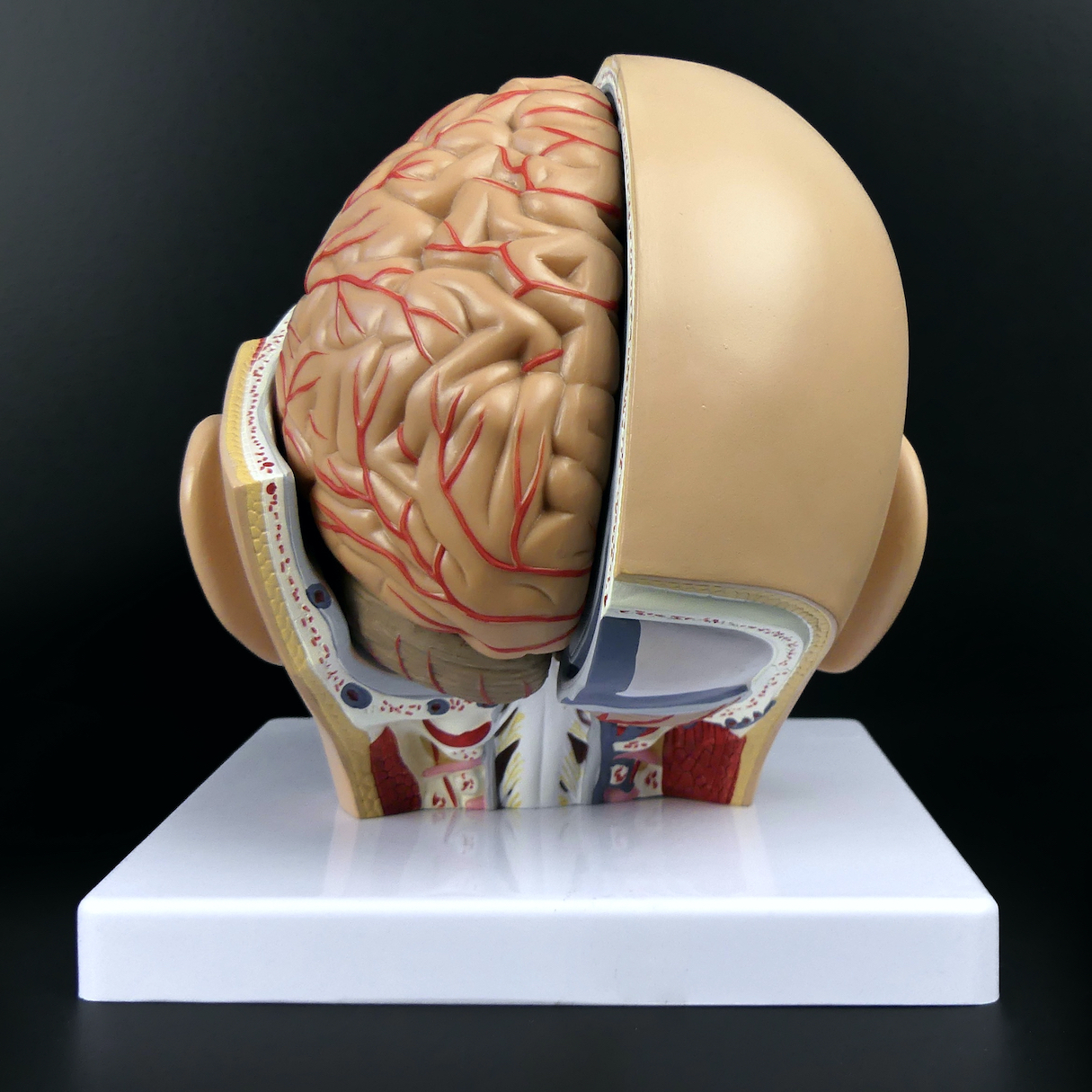 Ecorché didactique tête humaine avec cerveau présentée sur socle en PVC blanc – Modèle anatomique taille 1:1 annotée à la main vintage.