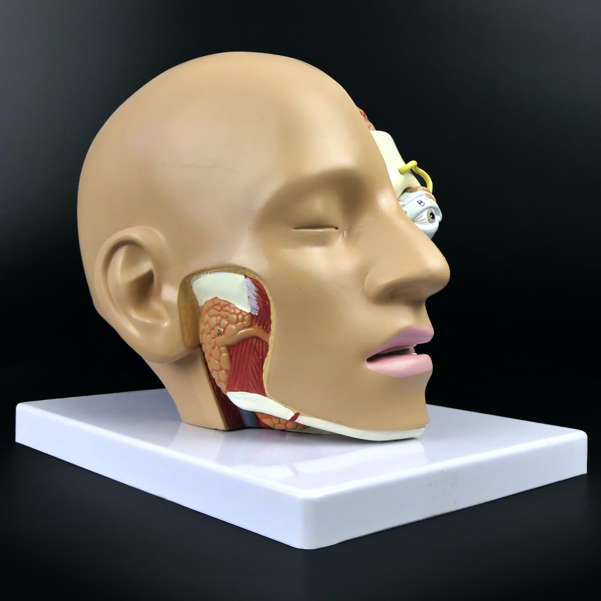 Moulage en PVC représentant une tête humaine en partie dépouillée de sa peau et des tissus graisseux, pour en faire apparaître les parties internes, veines et muscles.