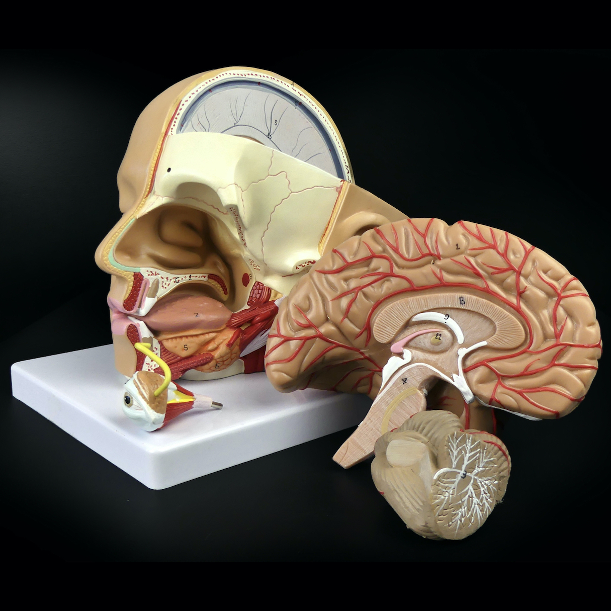 Outil anatomique d’enseignement vintage de la fin du XXe, composé en 4 parties : tête, moitié gauche du crâne, globe oculaire, cervelet et cerveau.