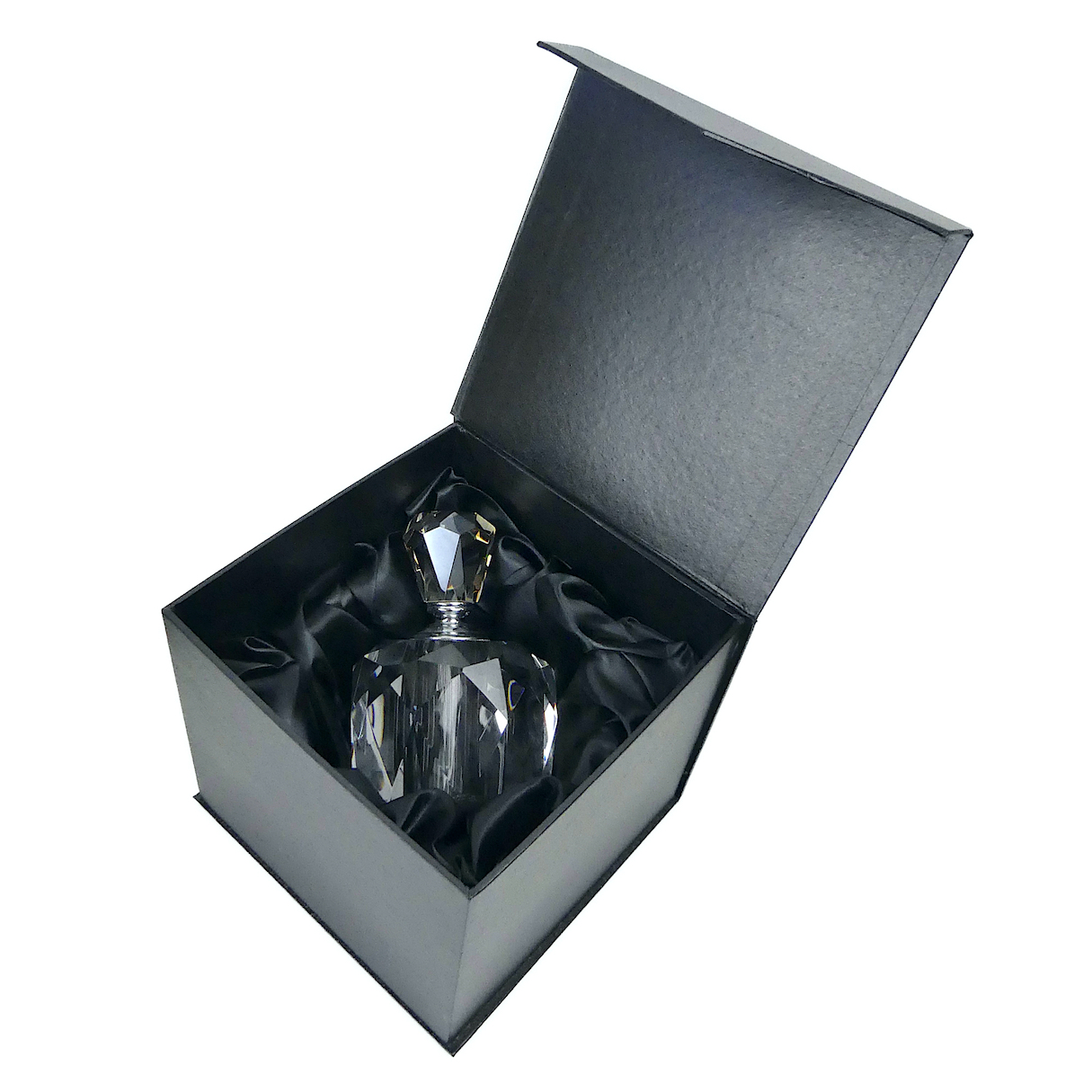 Flacon de parfum boule massif – Porte-parfum facetté en cristal véritable fait à la main en Italie, présenté dans son écrin noir.