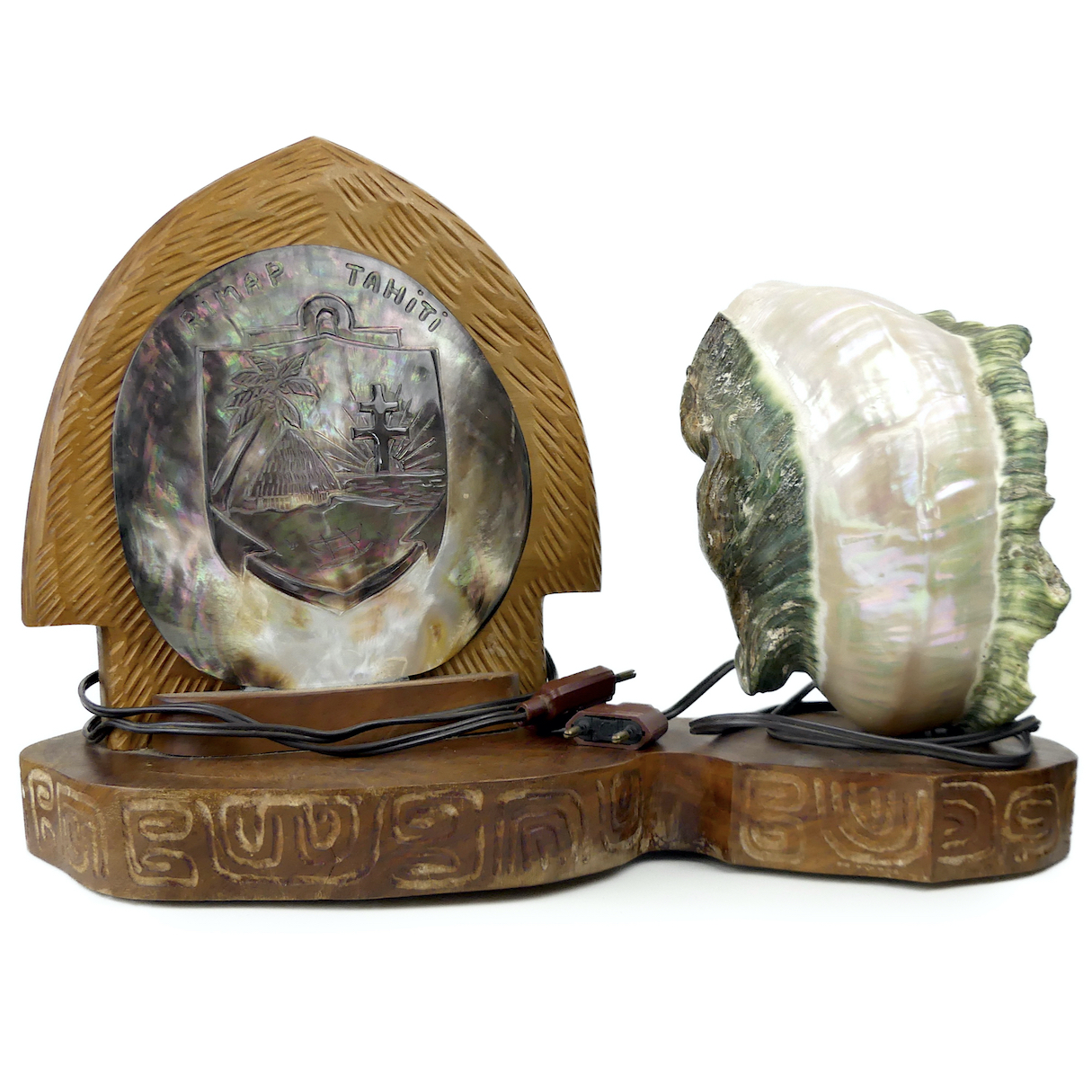 Lampe d’ambiance polynésienne double, à 2 prises électriques, 2 ampoules, en bois de rose (Miro), deux coquilles d’huîtres perlières irisées aux multiples nuances et reflets, de différentes tailles, fixées sur un morceau de bois clair ciselé, représentant une faré, et un gros coquillage Turbo Marmoratus poli vert et nacré – Objet souvenir du RIMAP de Tahiti.