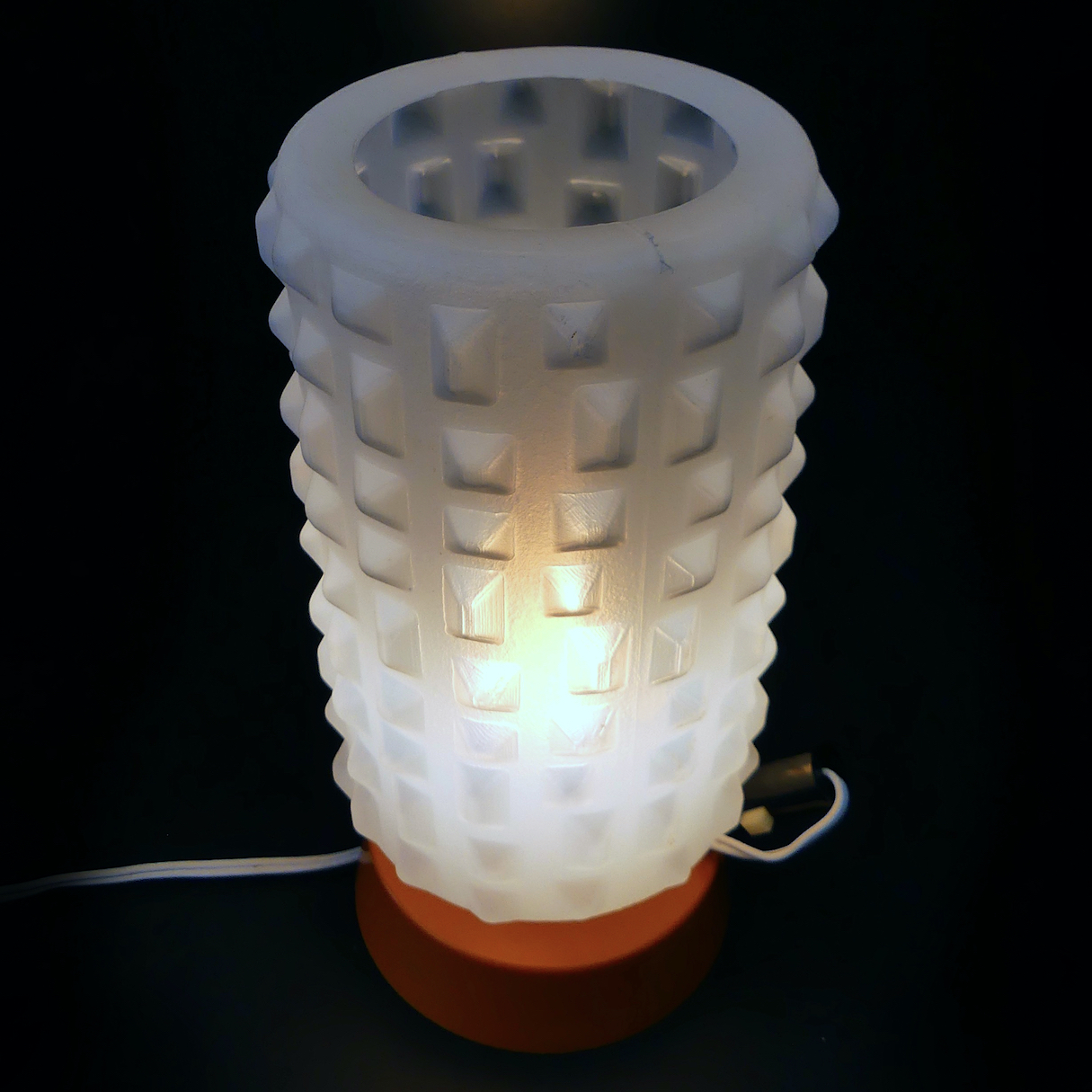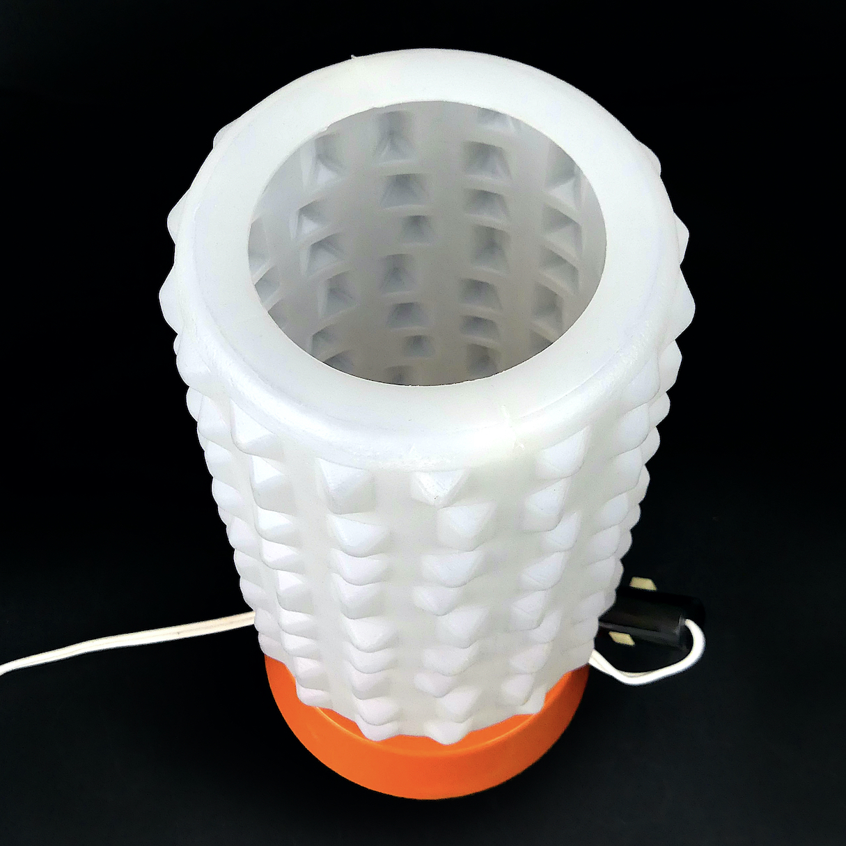 Cette petite lampe Pop est constituée de plastique, diffuseur cylindrique blanc translucide sur socle orange, avec un interrupteur noir – Joli luminaire typique des années 1970.