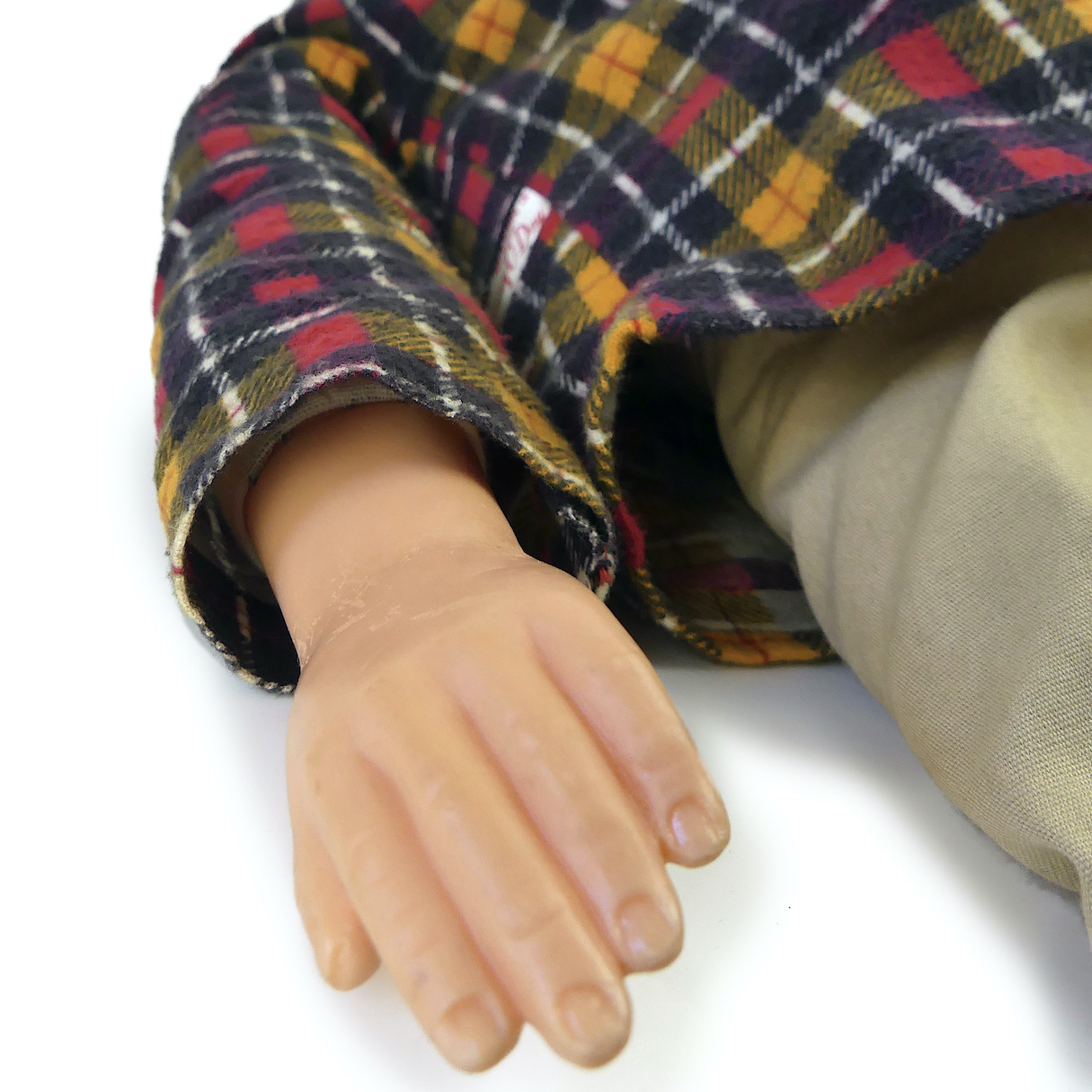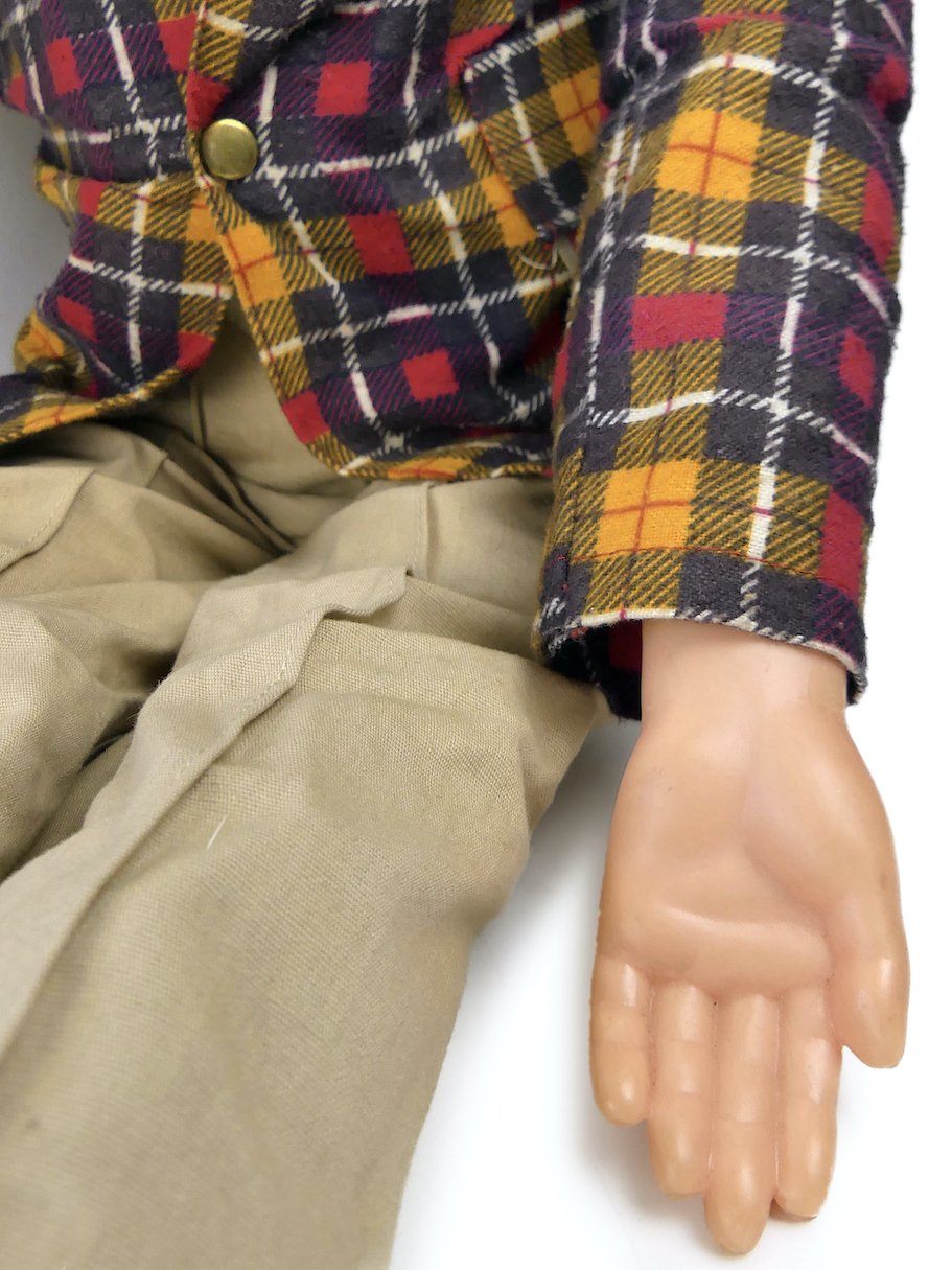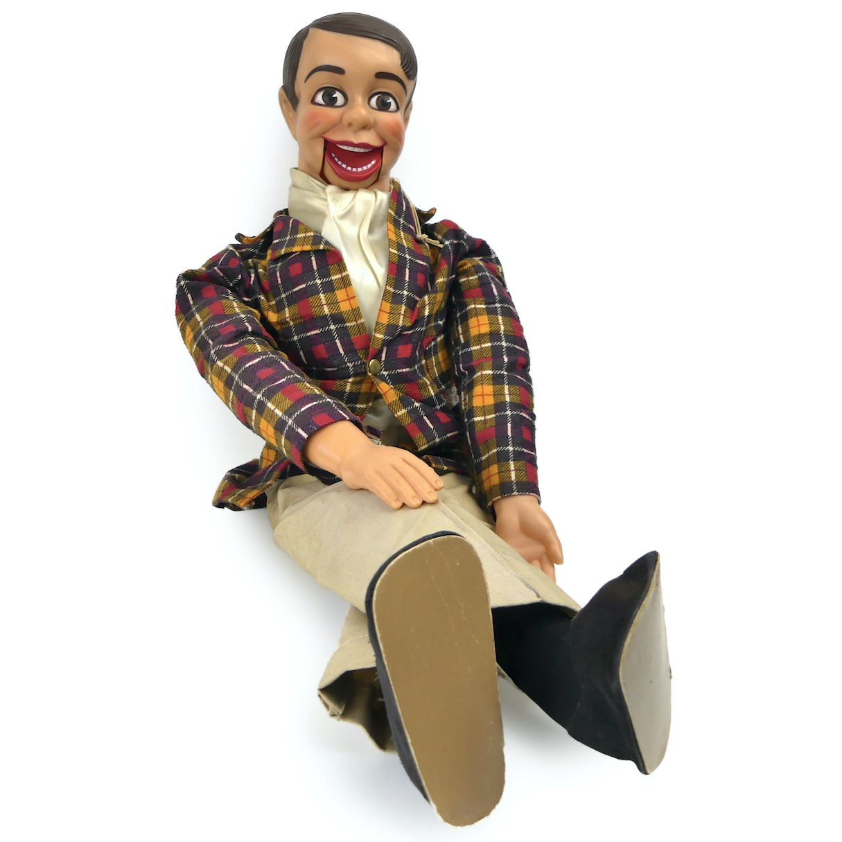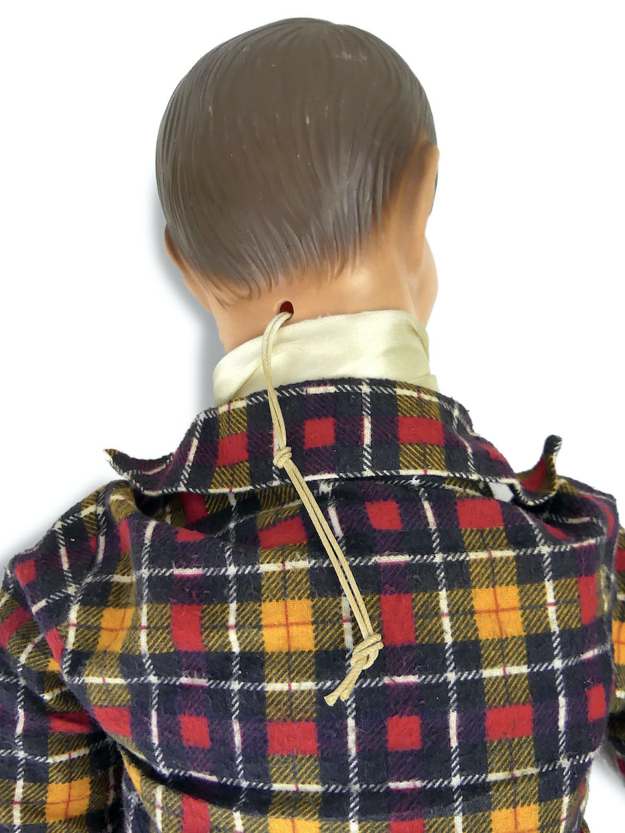 Poupée de ventriloque Danny O’Day Juro Novelty Company (1955-1977) de Jimmy Nelson (1950), habillé en costume, veste écossaise jaune rouge et bleu à bouton pression, plastron foulard en satin blanc, pantalon crème, chaussettes noires, petits chaussons en tissus noir et semelles en carton,, cheveux brun, corps en tissu, tête et mains en vinyle.