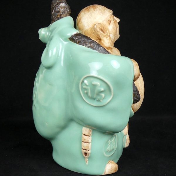 Il est sculpté dans du bois de cyprès japonais, et rangé dans son sac traditionnel en soie molletonnée rouge, chevrons moirés argentés, et lien marron.