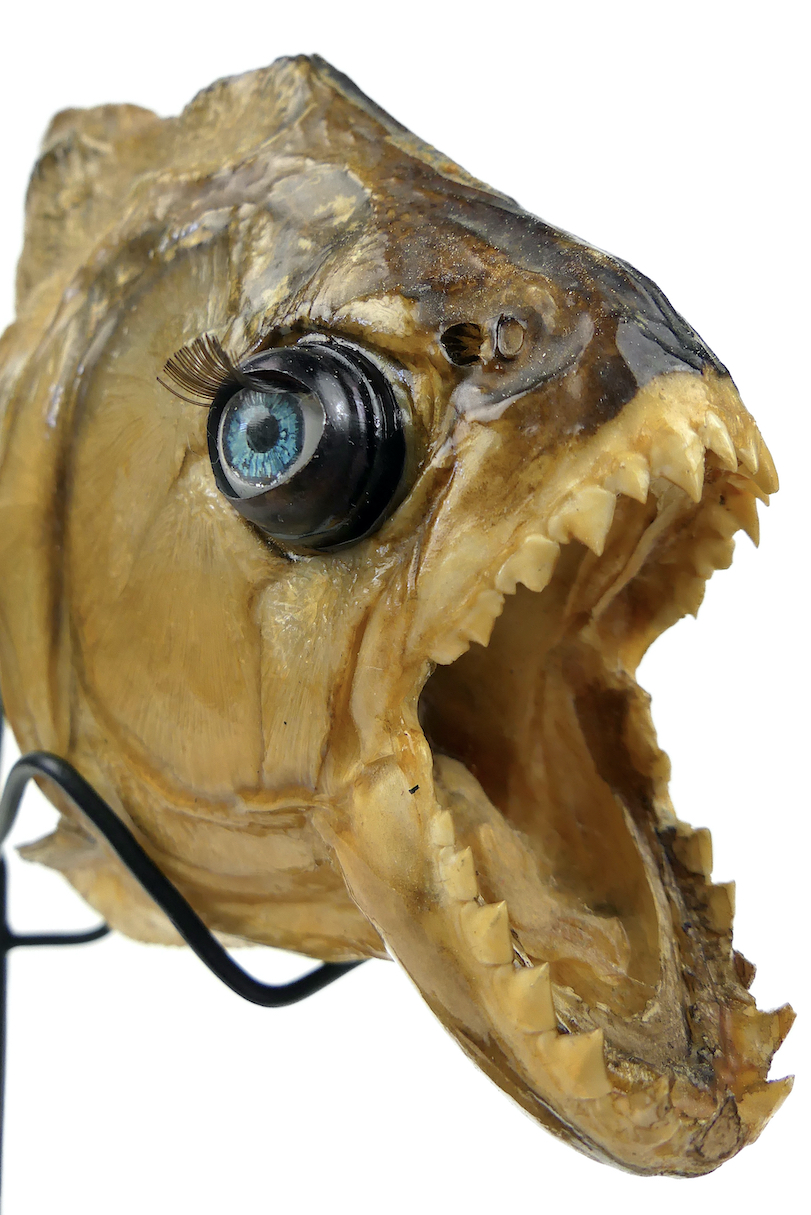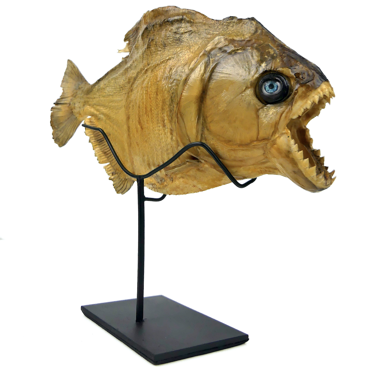 Grand piranha naturalisé aux yeux bleus de poupée présenté sur pied métallique noir, en position naturelle, courbée, et mâchoire grande ouverte.