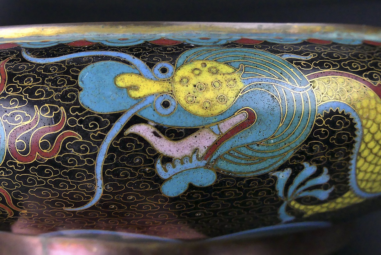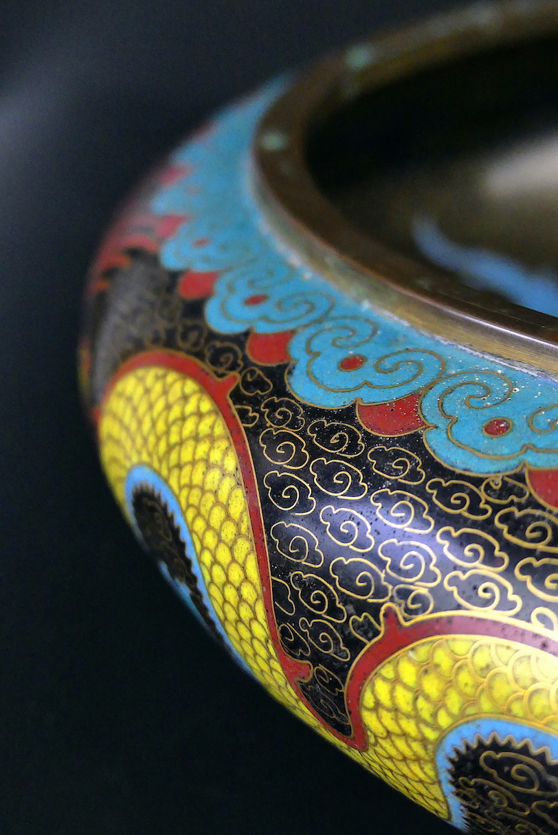 Superbe cloisonné ancien, rare et authentique, finement travaillé à la main, et délicatement décoré de frises traditionnelles, motifs chinois, nuages, vagues et 5 dragons.