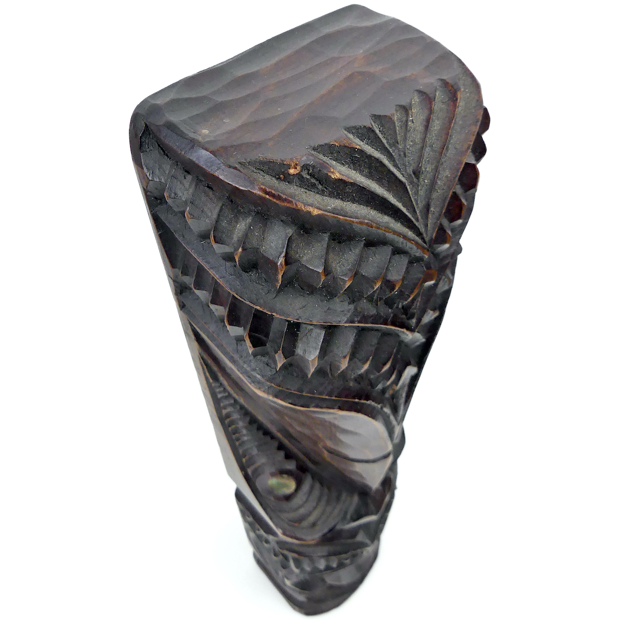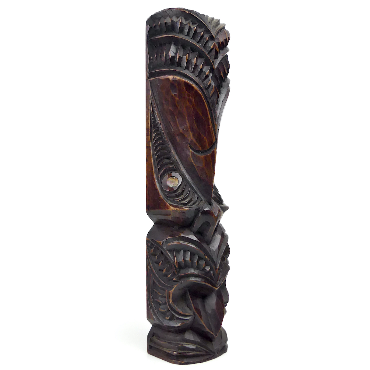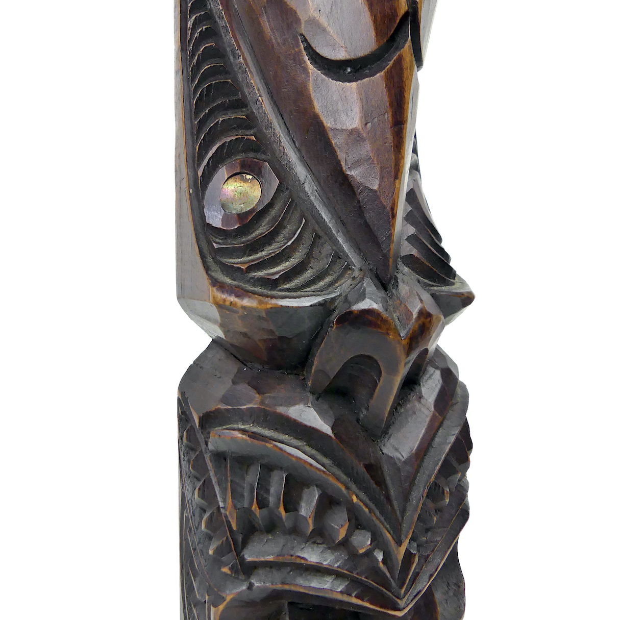 Teko Teko Māori céphalomorphe ancien sculpté en bois brun foncé et ormeaux – Mi-XXe – Art Maori – Nouvelle-Zélande