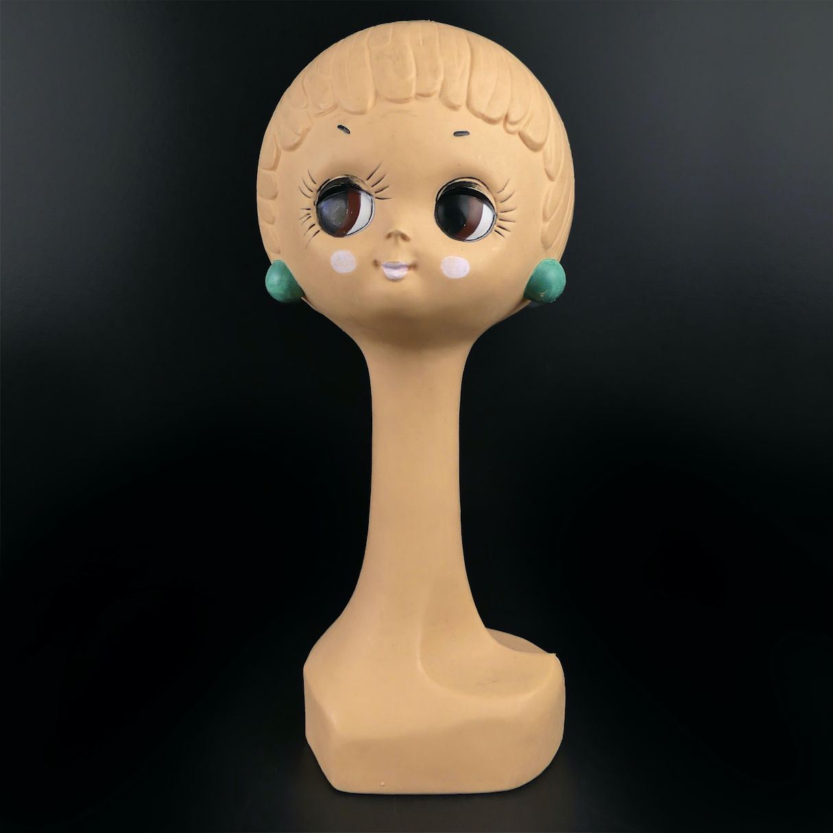 Tête Twiggy allemande ronde au long cou, buste de vitrine en plastique peint, délicatement maquillée, avec boucles d’oreilles boules vertes – Présentoir à chapeaux collector des années 60/70 – Allemagne – Déco pop vintage
