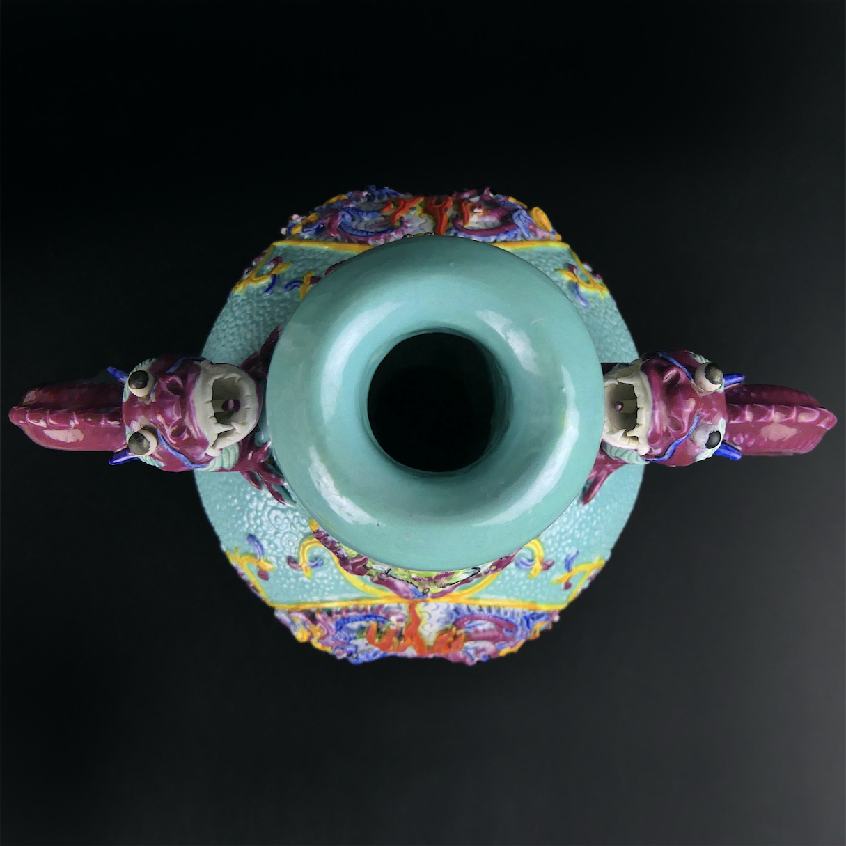 Le corps est moulé en relief, habillé de dragons concurrents bordés de fleurs de lotus, flammes, nuages, d’un pied moulé avec vagues, le tout décoré de turquoise, de glaçures jaunes et vertes.