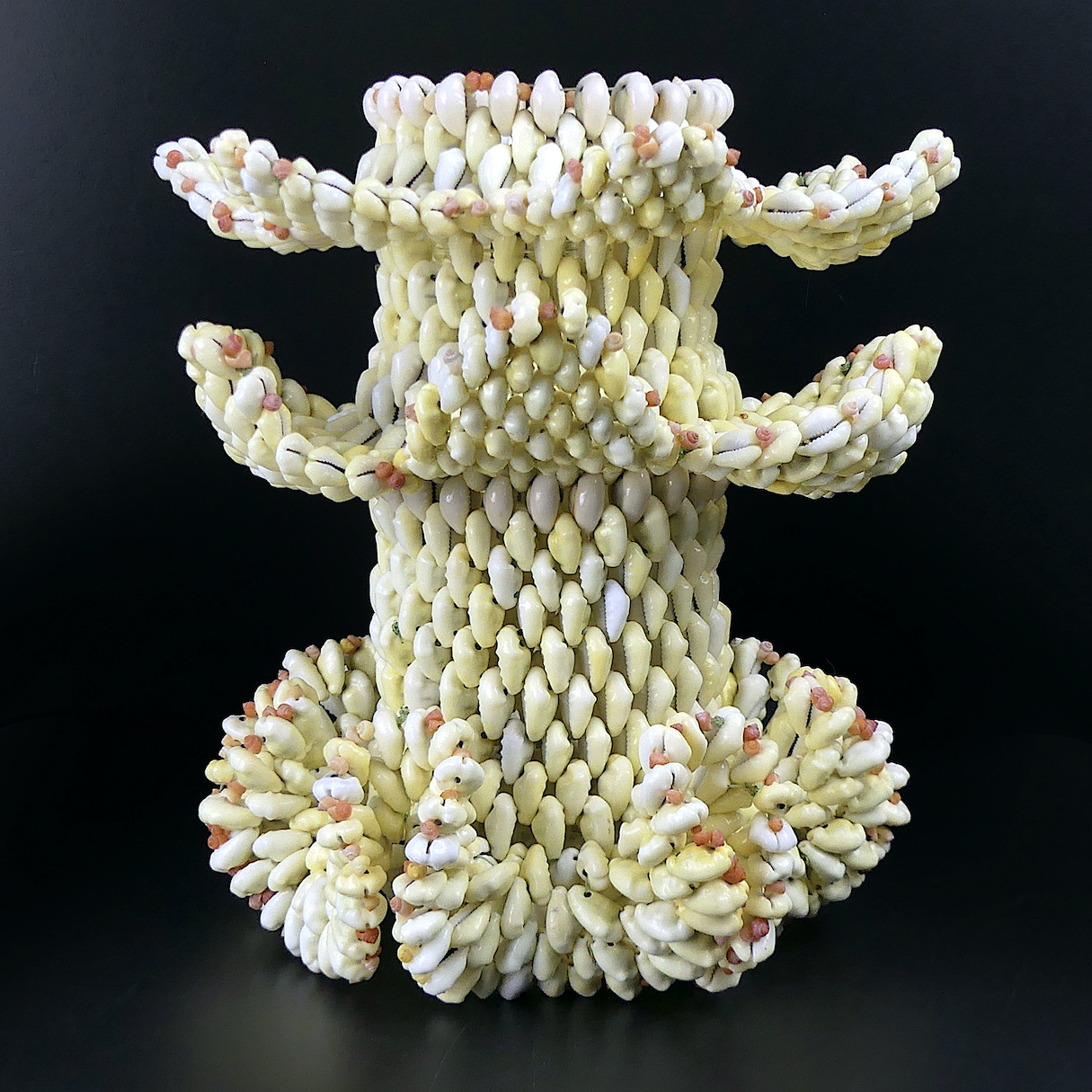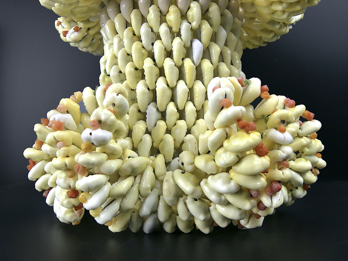 Vase floral polynésien tressé d’une multitude de petits coquillages roses, petits gastéropodes marins, et cauris – Artisanat polynésien
