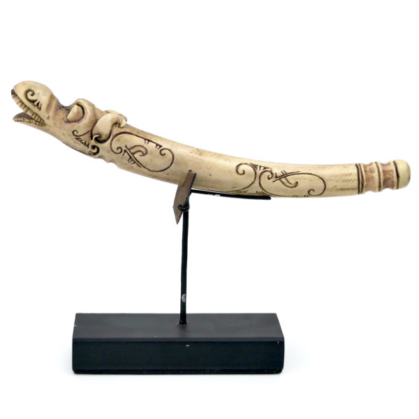 Petit racloir Dayak en bois de cervidé clair sculpté sur socle noir Bornéo