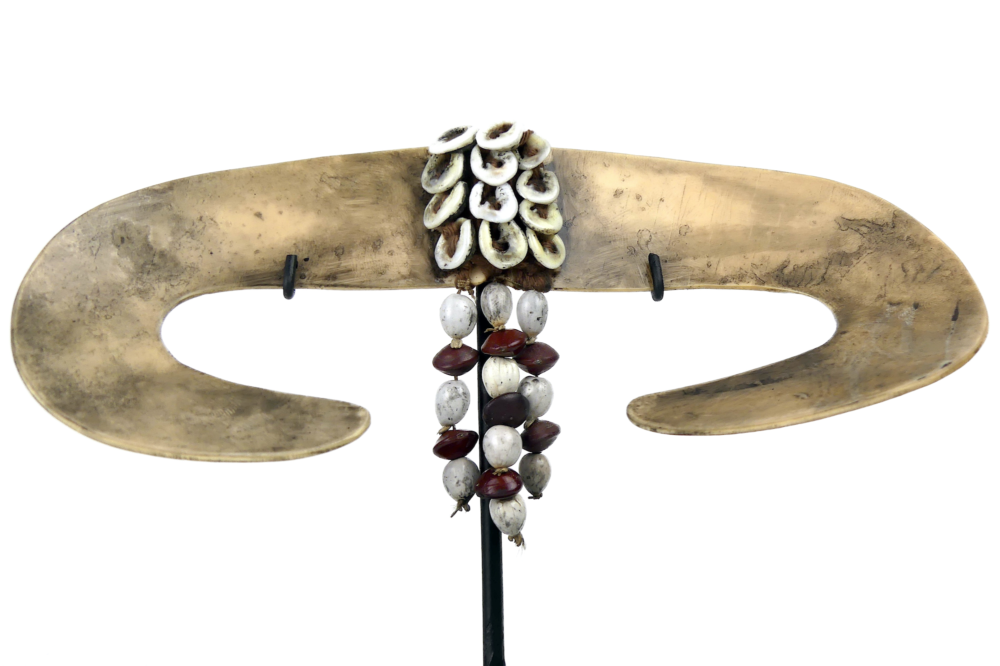 Bipane asmat Irian Jaya ornement nasal sur socle en coquillage taillé, cauris et graines rouges et blanches – Papouasie-Nouvelle-Guinée