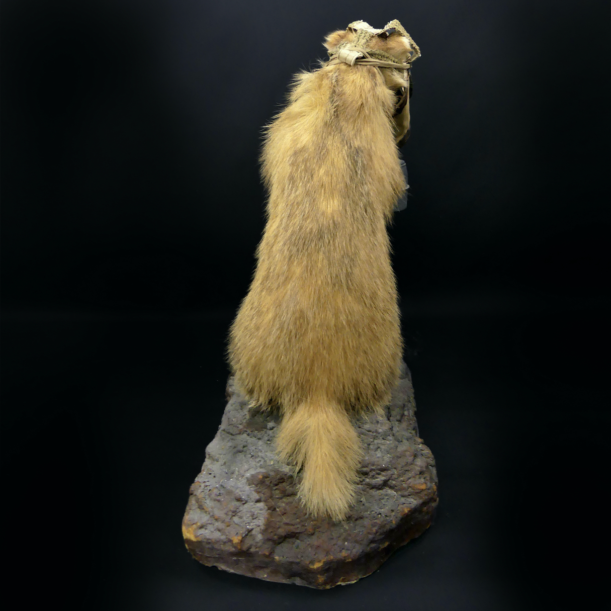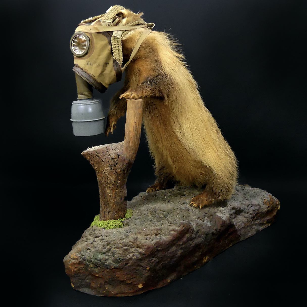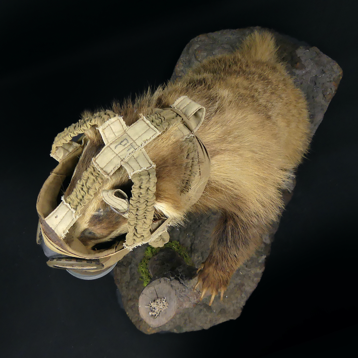 Blaireau naturalisé par un taxidermiste, en position debout, mis en scène avec un masque à gaz filtrant de la 2nde Guerre Mondiale, et présenté sur un décor en mousse expansive peinte et bois – Meles meles – Blaireau commun – Taxidermie – Histoire naturelle