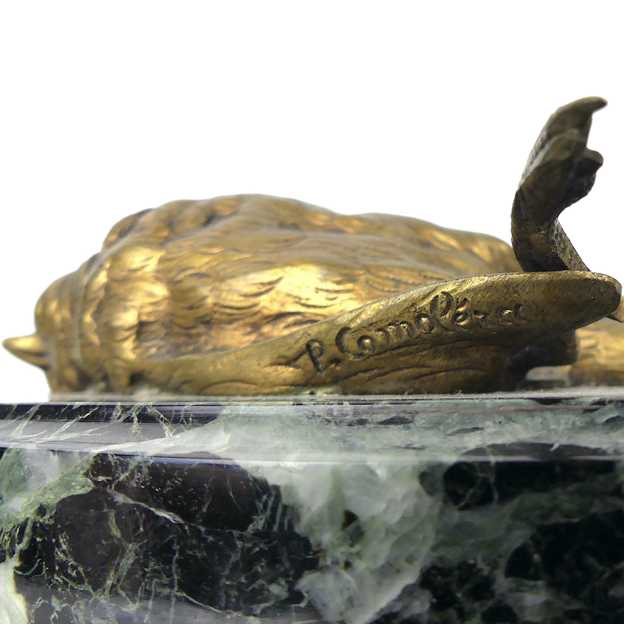 Bronze d’oiseau mort signé en bronze patiné du sculpteur animalier français Paul Comolera (1818-1897), fixé sur une plaque de marbre vert de mer – Courant du Naturalisme – Objet de curiosité