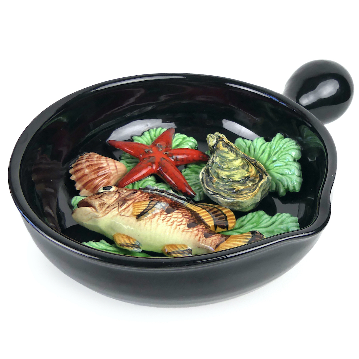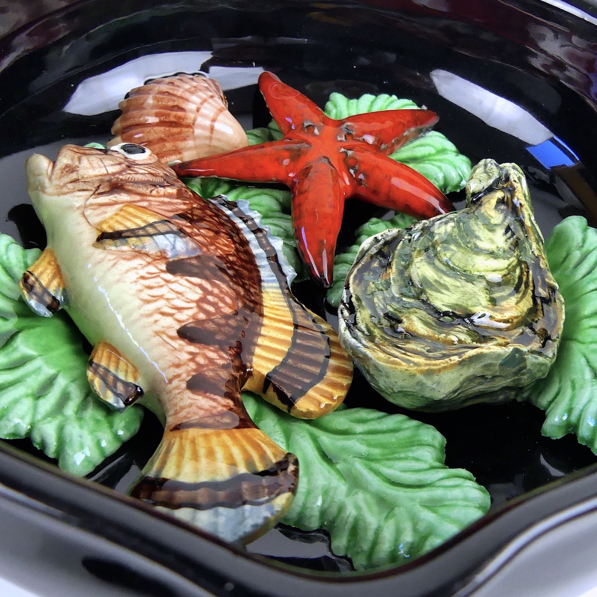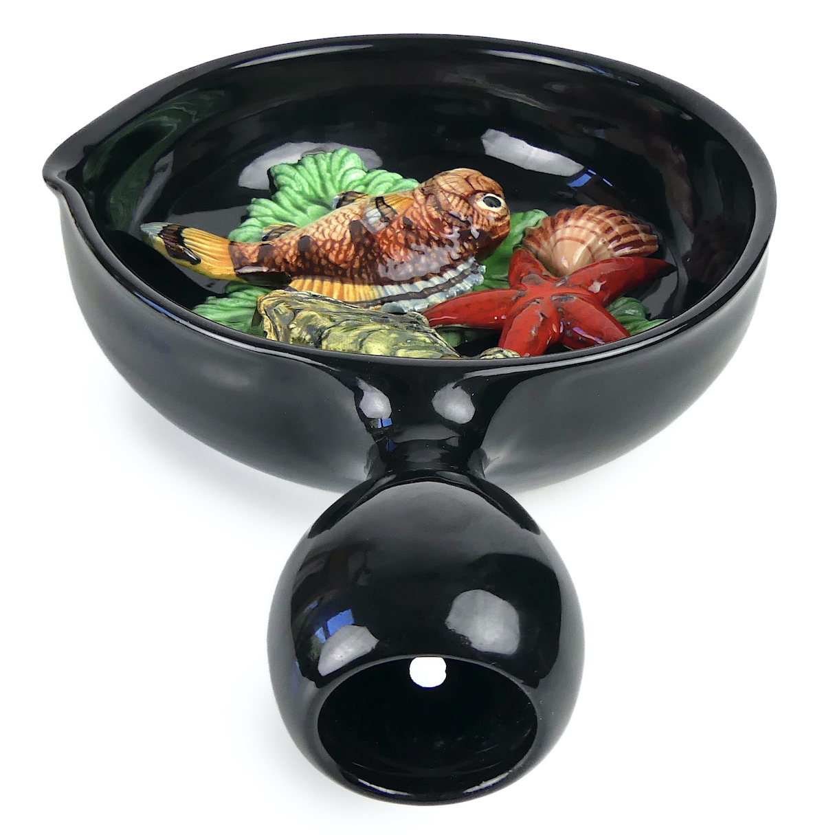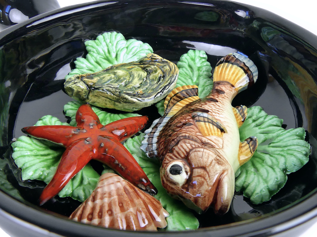 Caquelon provençal en céramique vintage sur fonds noir brillant, décorés en barbotine de poisson (rascasse), étoile de mer rouge, huître, coquillage et feuilles (salade ou algue).