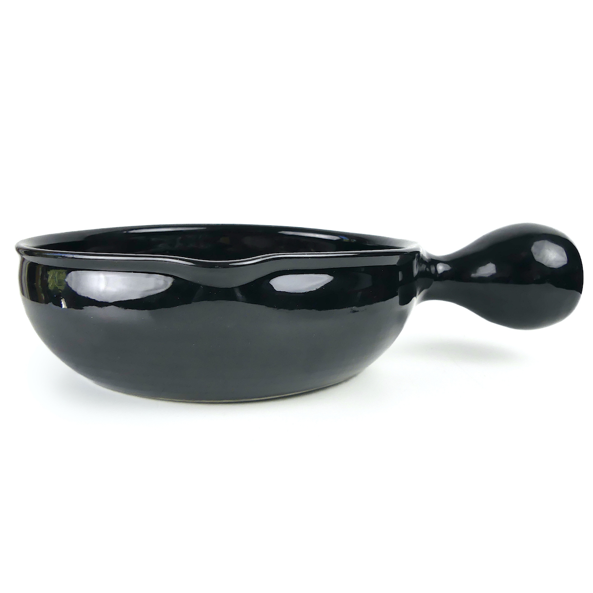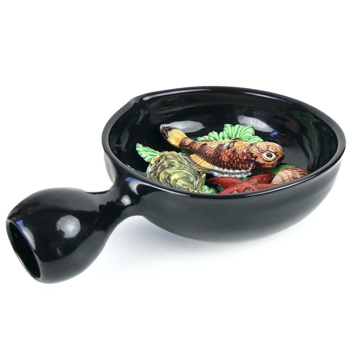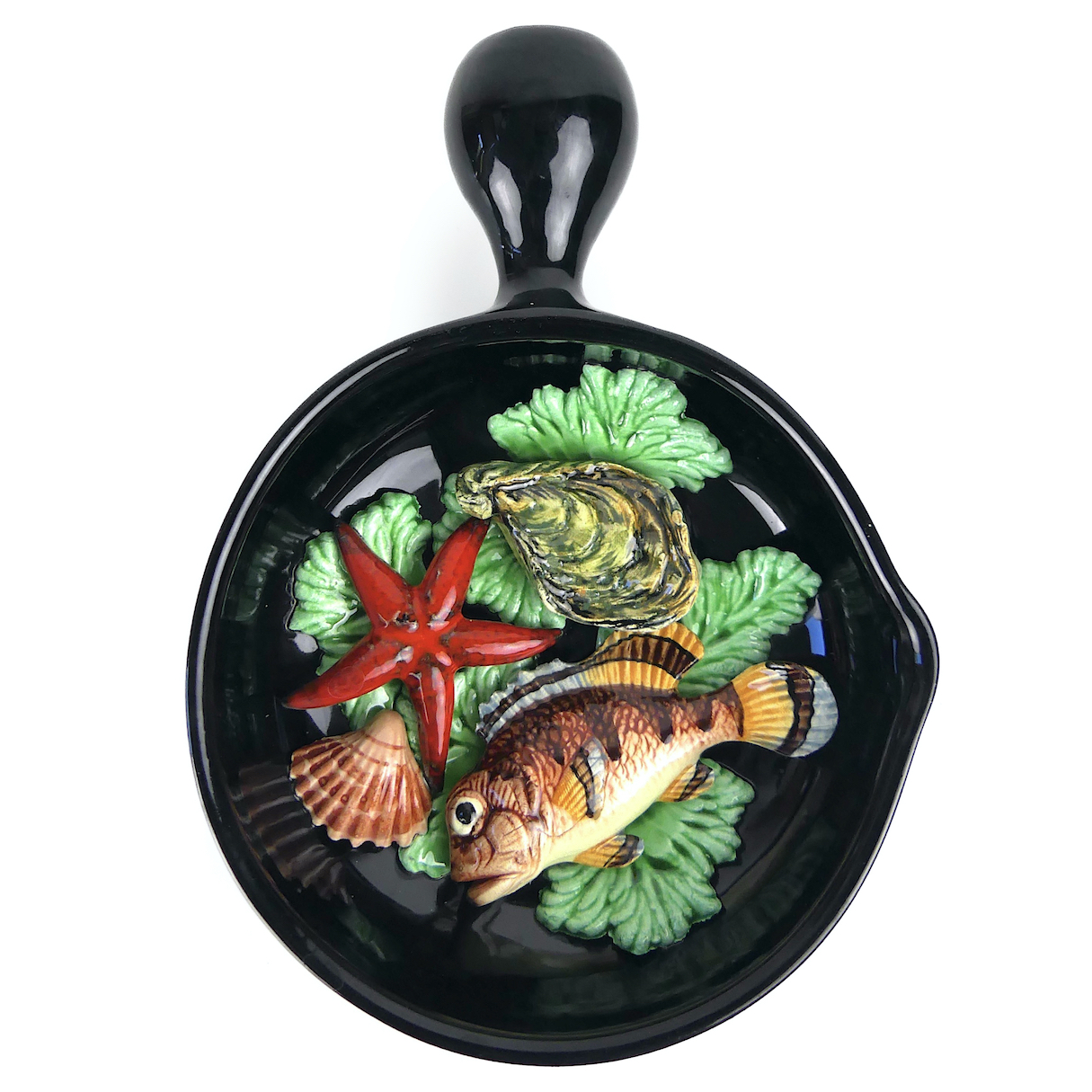 Caquelon provençal en céramique vintage sur fonds noir brillant, décorés en barbotine de poisson (rascasse), étoile de mer rouge, huître, coquillage et feuilles (salade ou algue).