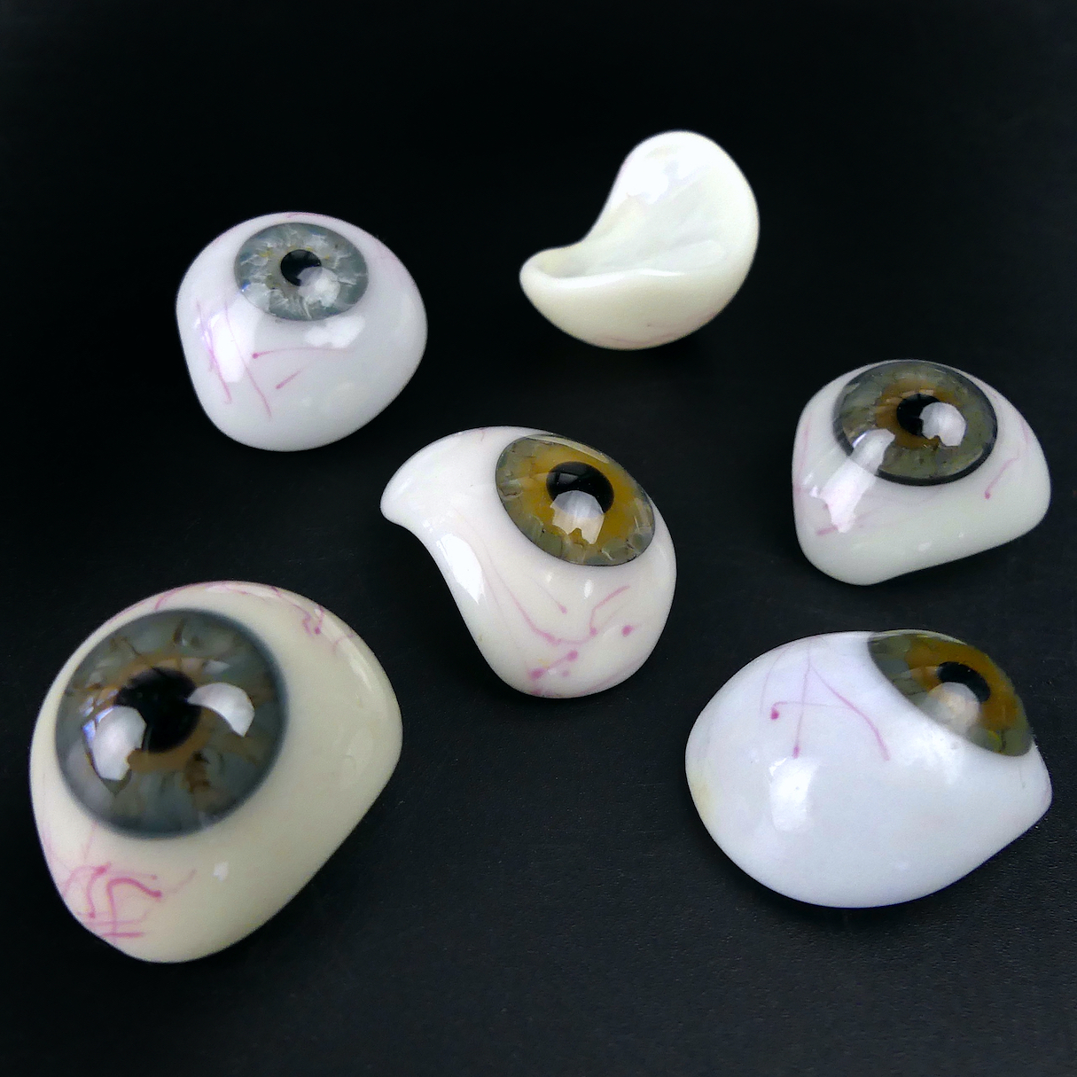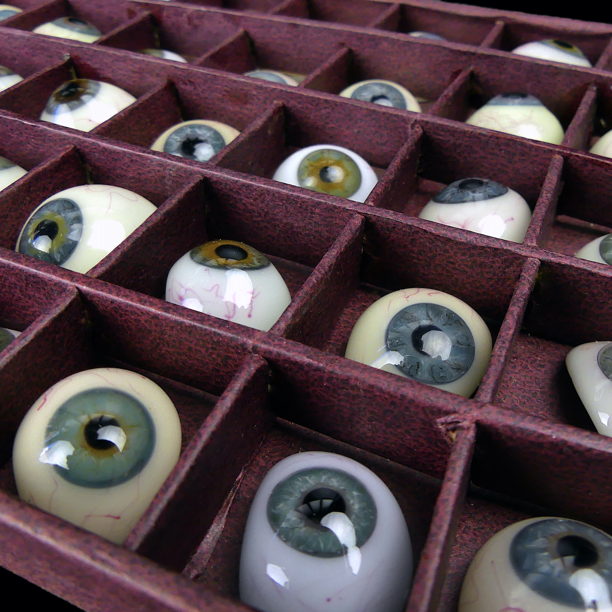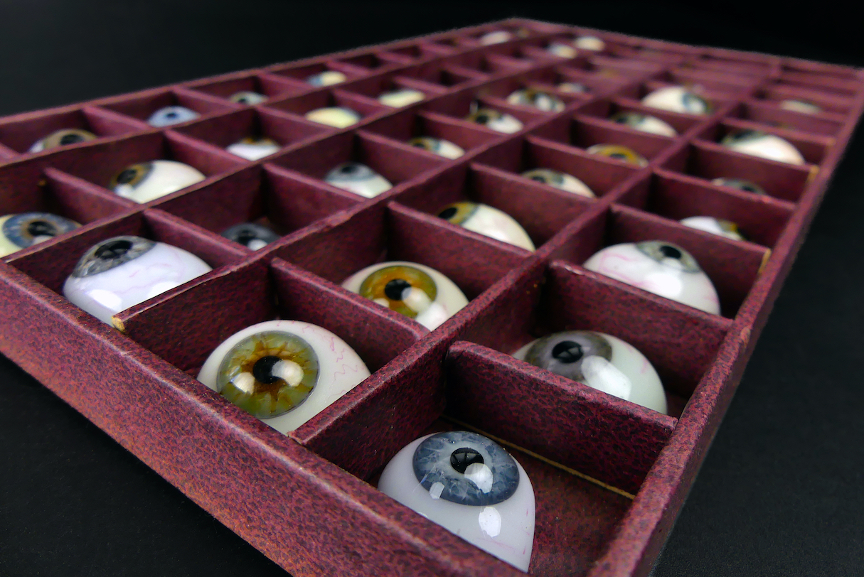 Coffret de 50 prothèses oculaires, yeux de verre fabriqués sur moulages et sur mesure par un prothésiste oculariste agréé.