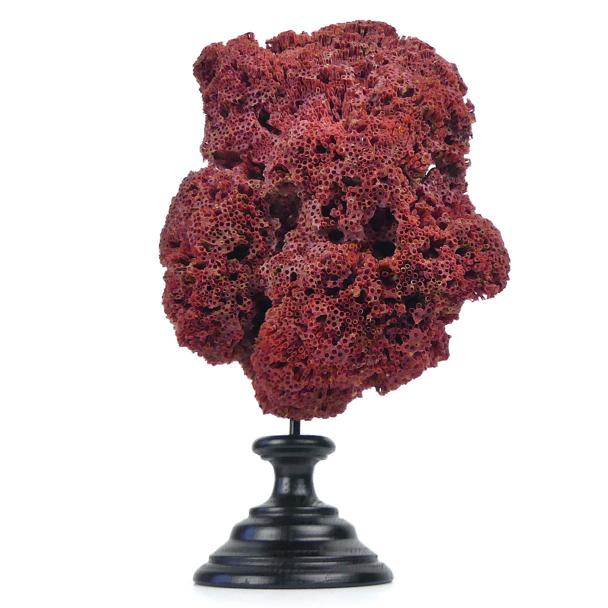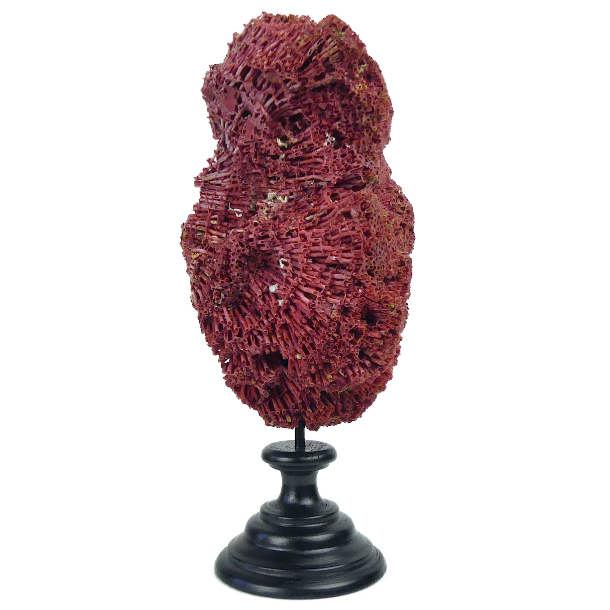 Corail rouge Tubipora Musica ancien présenté sur pied en bois tourné noir – Curiosité marine