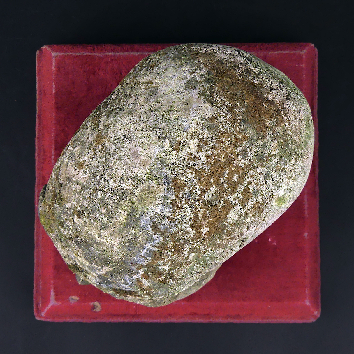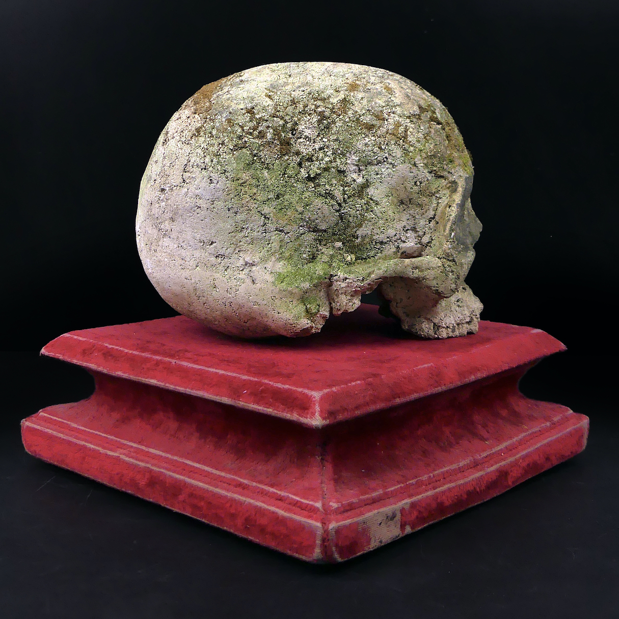 Crâne en pierre sculptée avec marques d’extérieur (mousse végétale et traces noires) présenté sur large piédestal en bois recouvert d’un verlours rouge (usé).