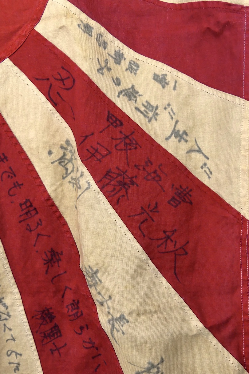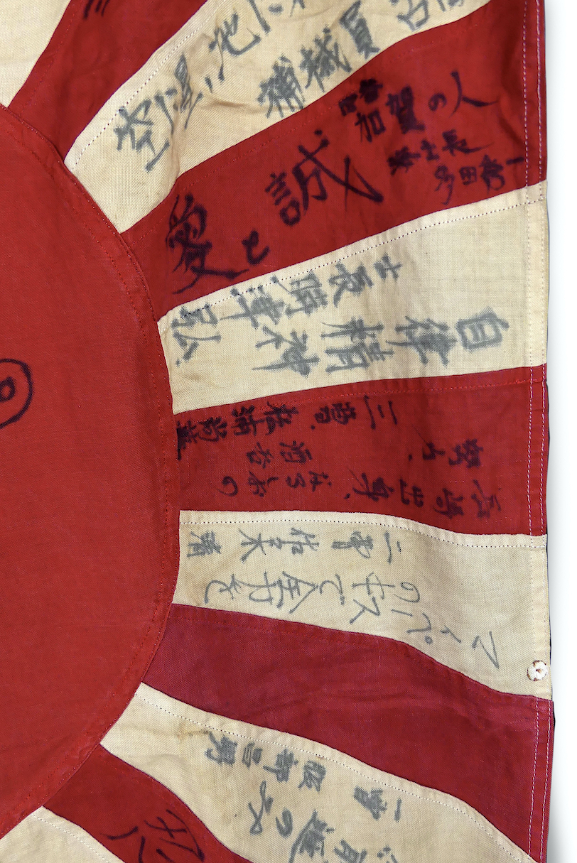 De nombreux messages chaleureux sont inscrits sur le drapeau, et parmi eux, on peut voir les mots « Empire du Japon 大日本帝国 ».
