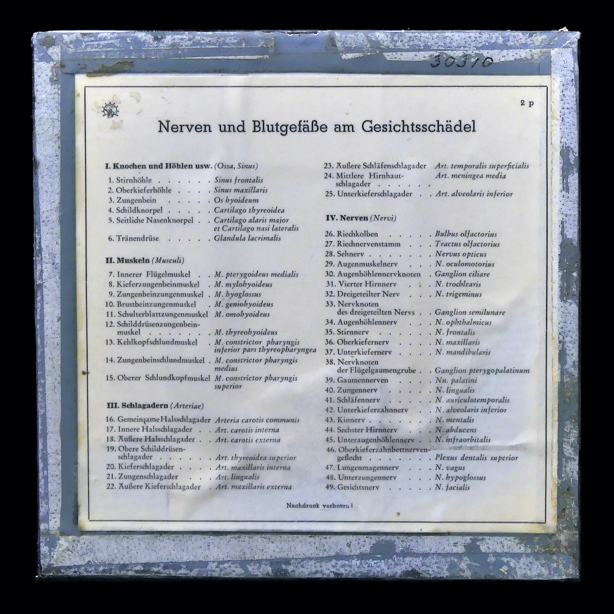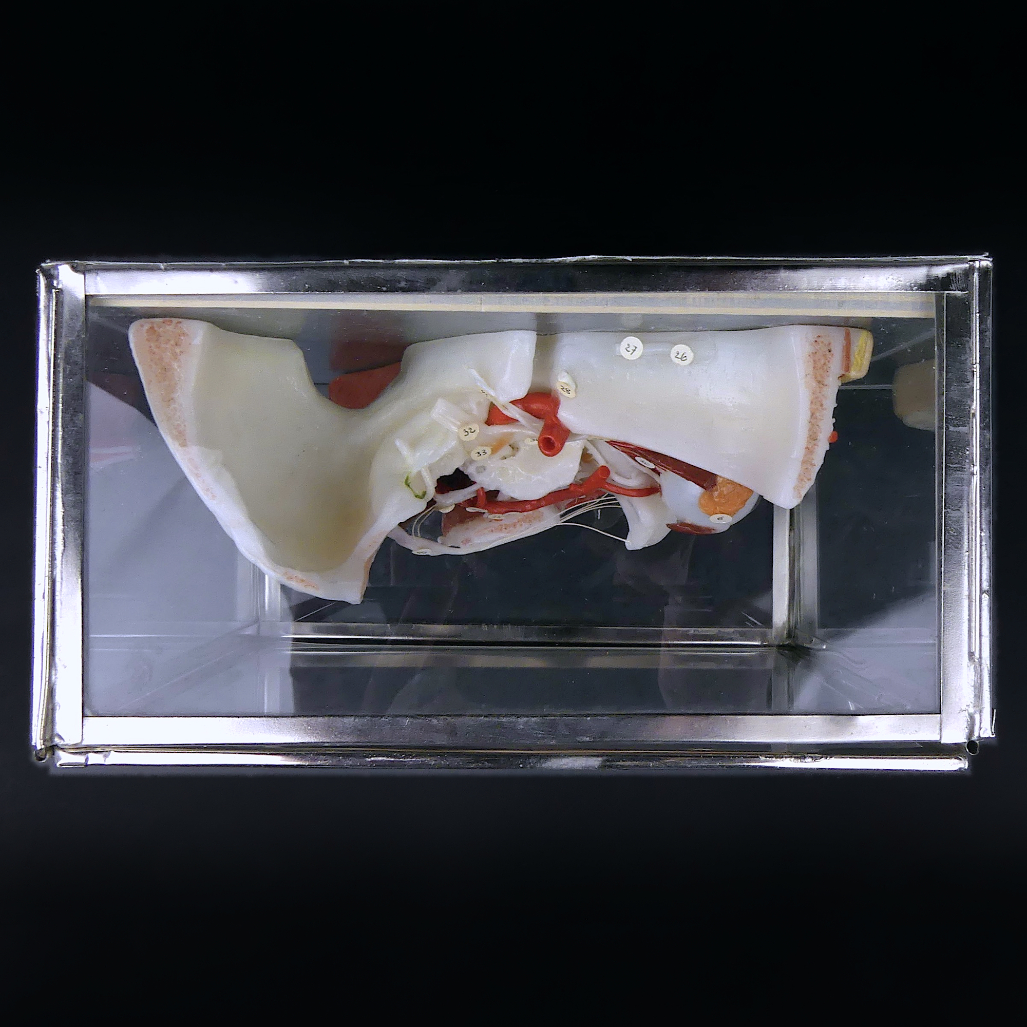 Ecorché en cire demi-tête humaine présentée dans sa petite vitrine de verre à armature métallique – Modèle anatomique numéroté à la main vintage – Curiosité rare en excellent état – Allemagne – Légende au dos – Nerfs et vaisseaux sanguins du crâne facial.