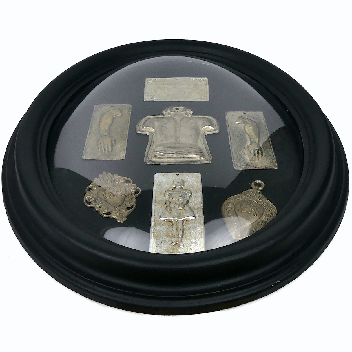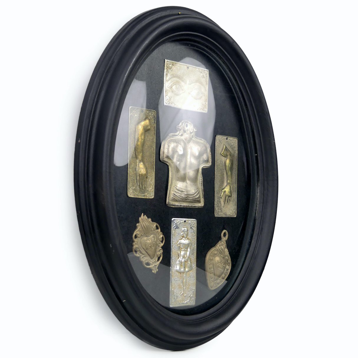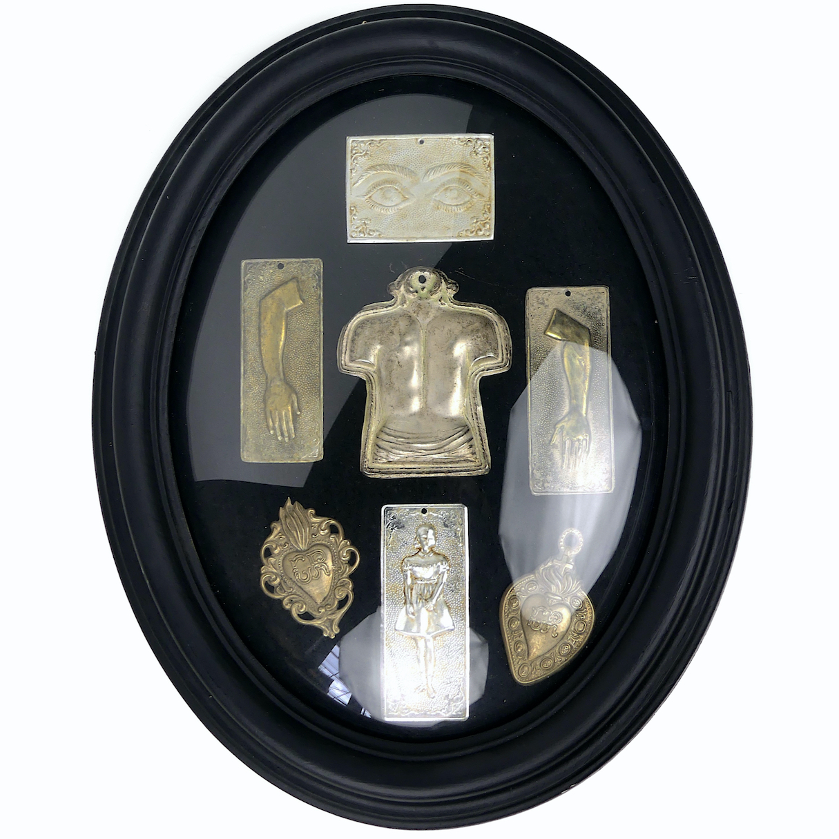 Ensemble de 7 offrandes votives anatomiques en métal dans un cadre ovale noir Napoléon III et verre bombé – Ex voto – Curiosité – Début XXe