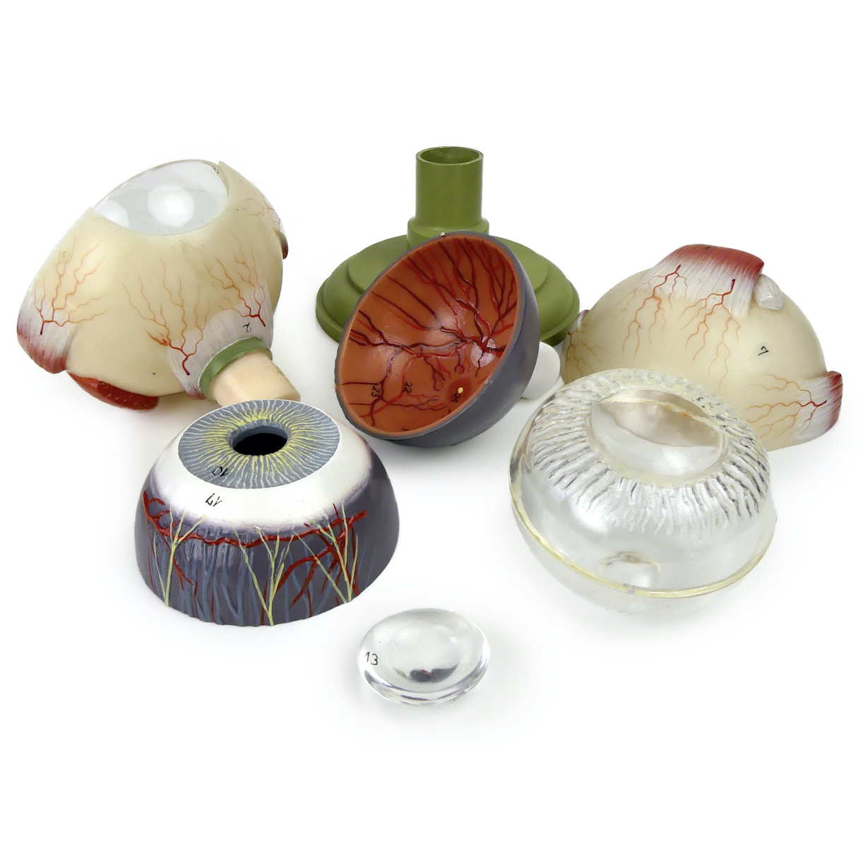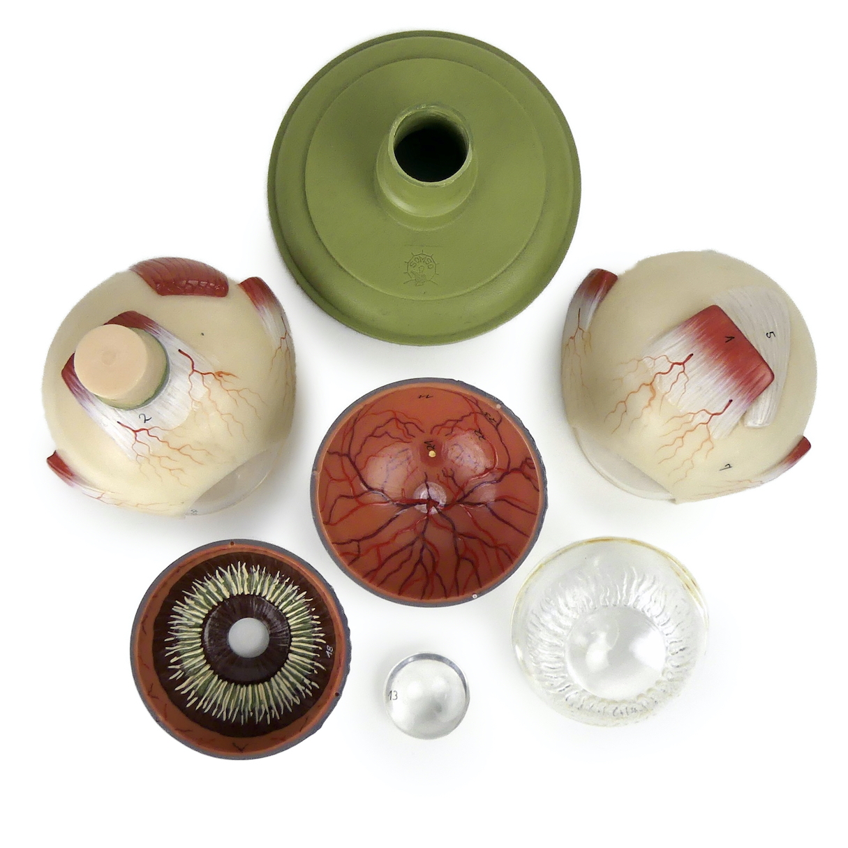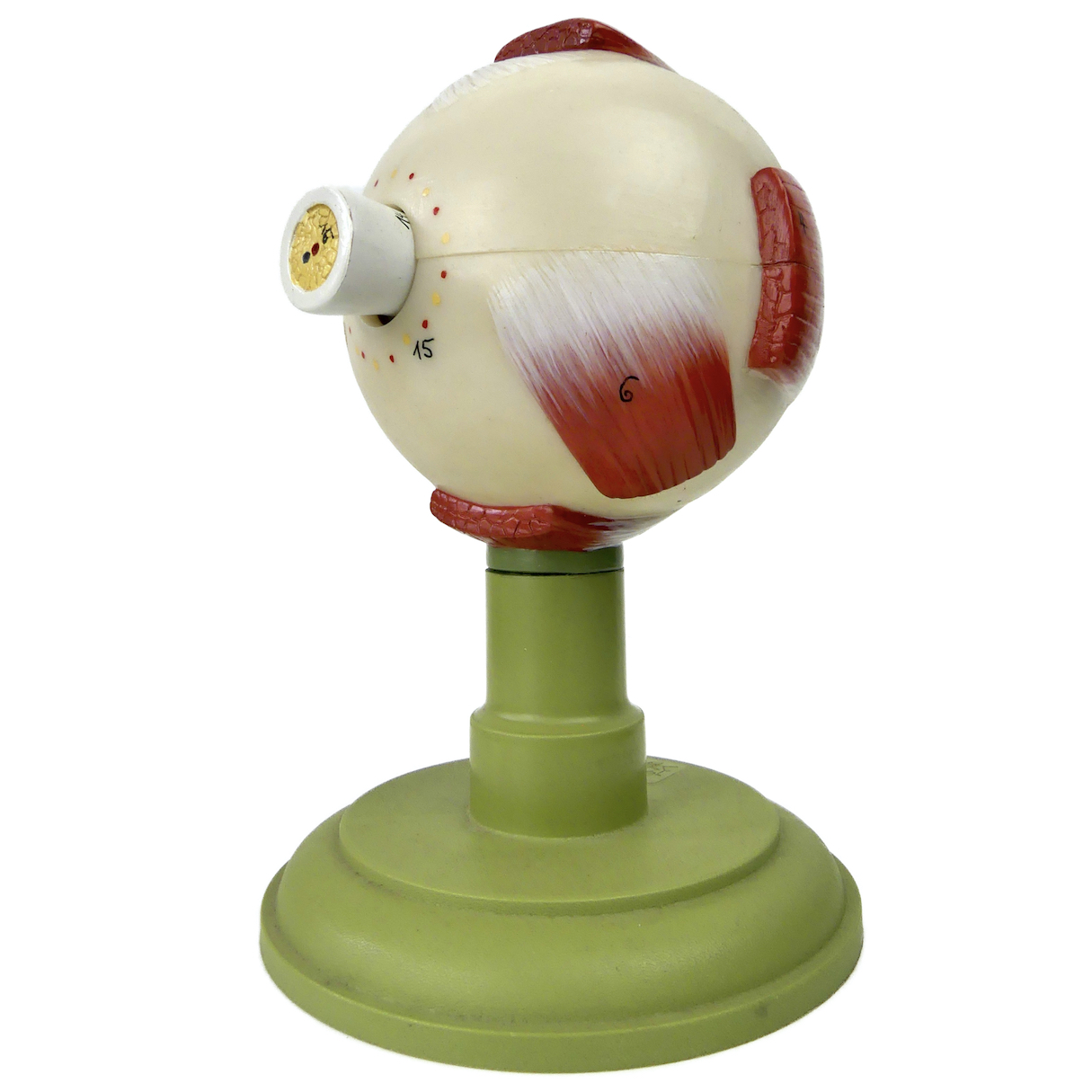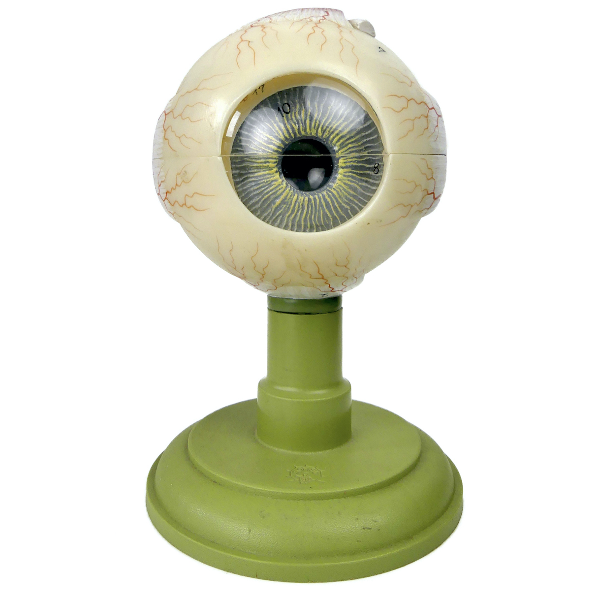 Globe oculaire SOMSO vintage modèle anatomique didactique constitué de 7 parties démontables, sur pied en plastique vert.