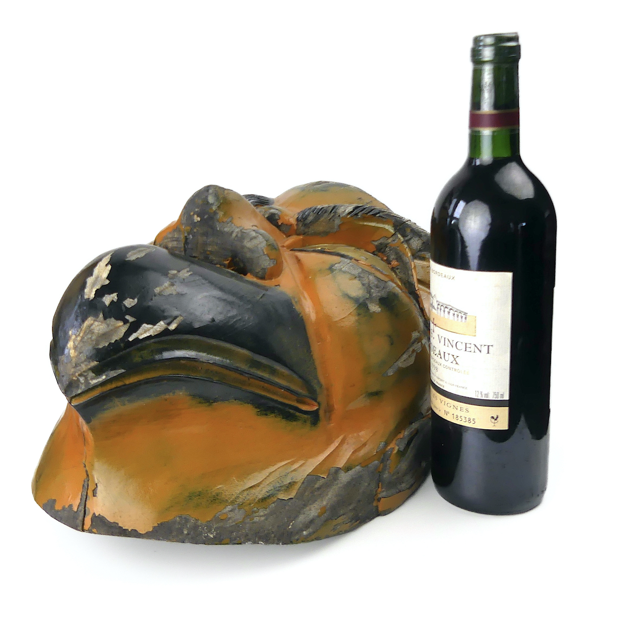 Grand masque Karasu-tengu ornemental en bois massif laqué, lourd, orange, noir et or, en bois et laque sèche, finement décoré à la main.