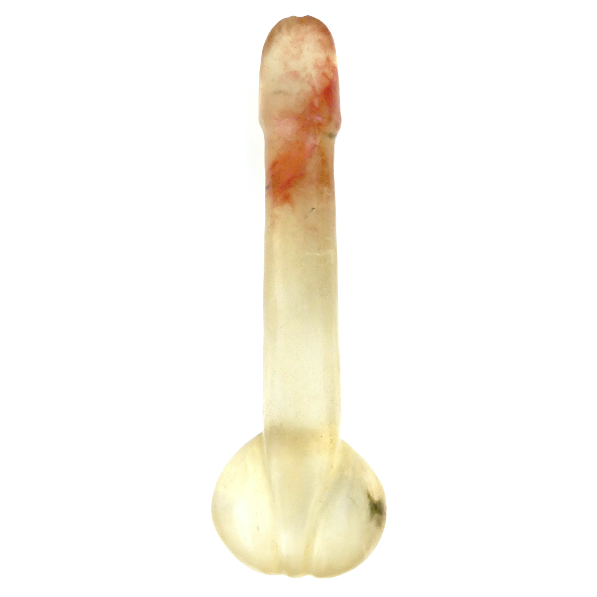 Grand phallus chinois ancien en pierre taillée transparente, probablement en citrine, légèrement teintée de rouge à son extrémité, et présentant quelques impuretés à cœur.