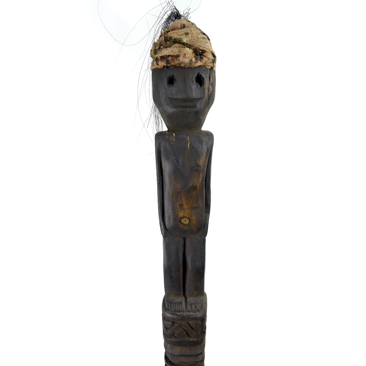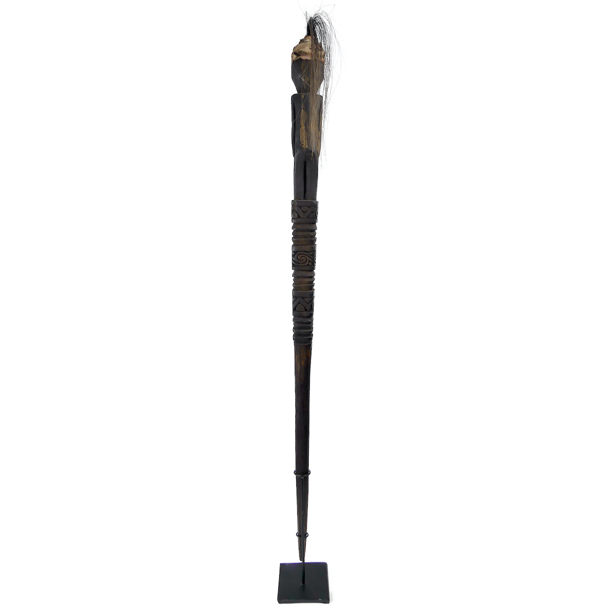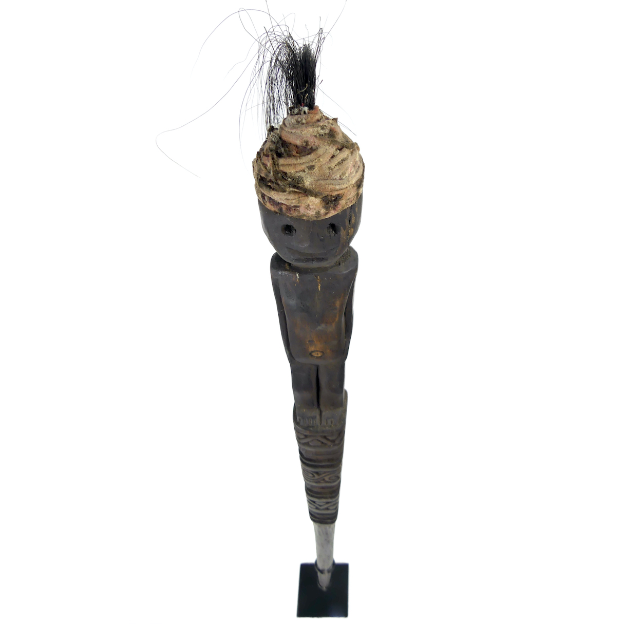 Grand Tun Tun en bois sculpté, crin et tissus, soclé, bâton de chasse de la culture Dayak, Kalimantan, Bornéo, Indonésie