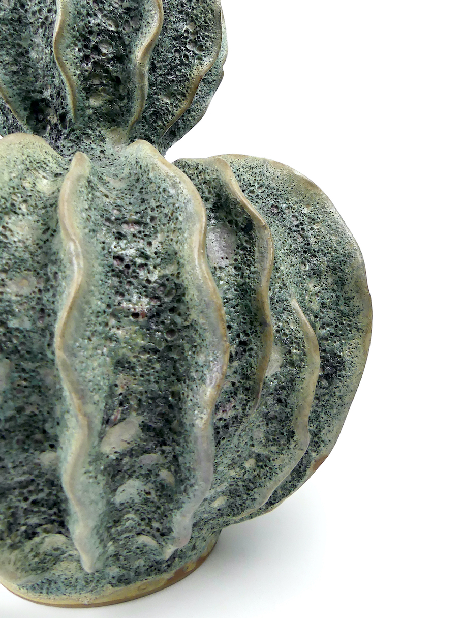 Grand vase organique double gourde vert de gris en céramique à glaçure « écume de mer », de forme généreuse, rappelant les plantes grasses à tige charnues, genre cactées, plantes aquatiques, ou encore animaux marins, type anémones.