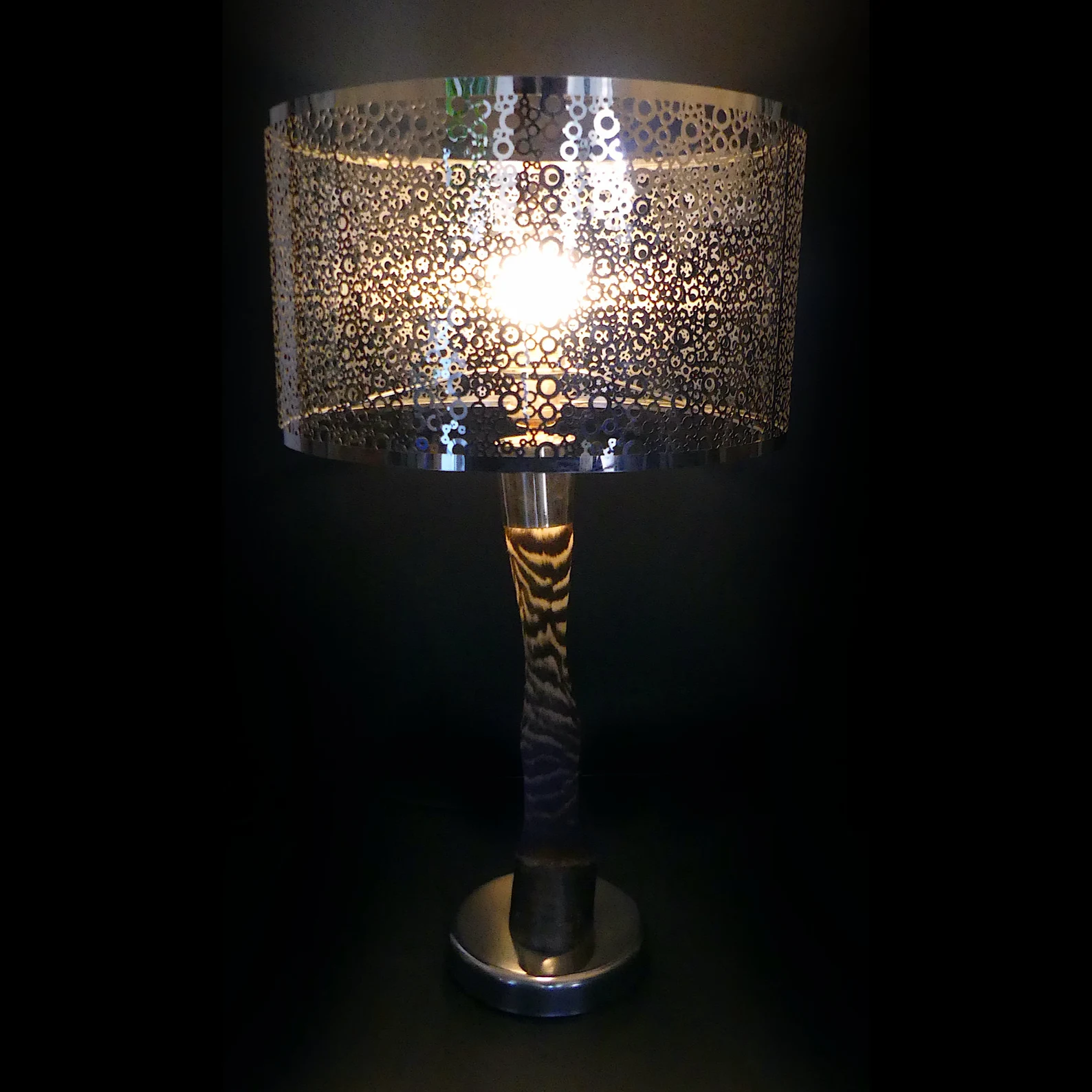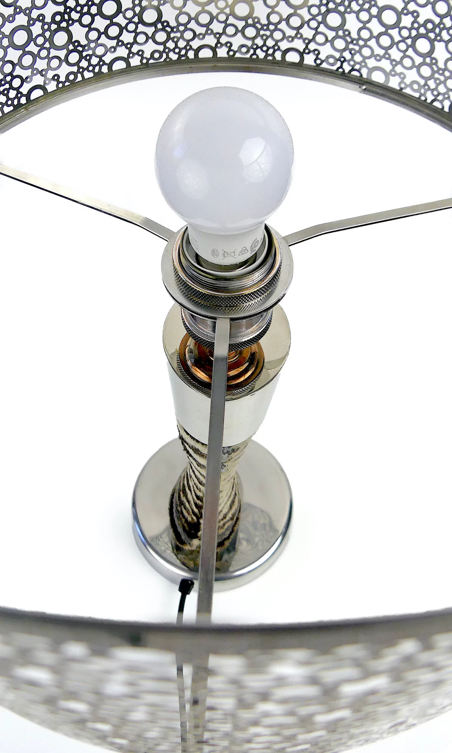 Grande lampe zèbre design, montée sur socle rond chromé et grand abat-jour cylindrique ajouré, composé d’anneaux métalliques des tailles différentes.