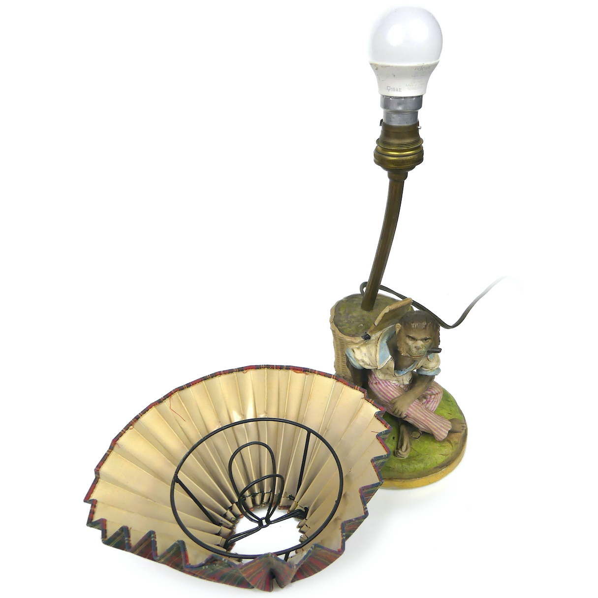 Une tige en laiton monte sur l’arrière, avec au bout, une douille à baïonnette, une ampoule, un abat-jour plissé en tissus écossais et ruban sur le devant.