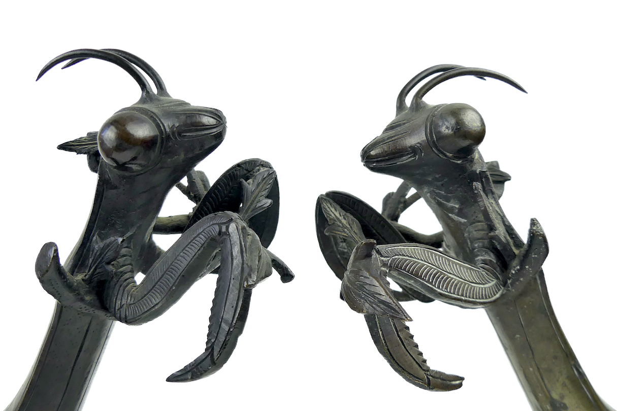 Mante religieuse ancienne en bronze patiné – Porte-plume gauche – Mantis religiosa – Art Nouveau – Bronze animalier